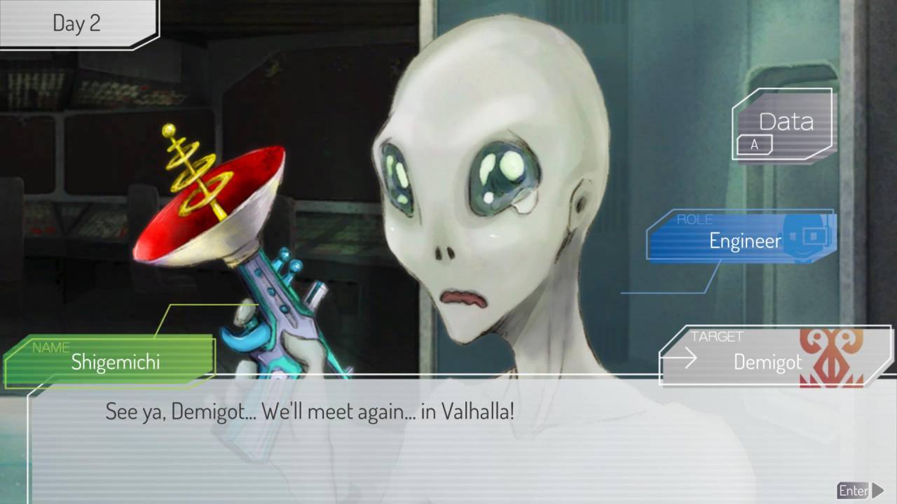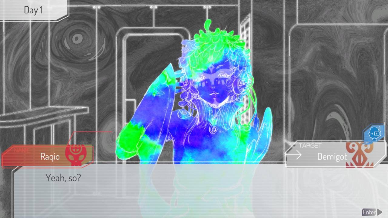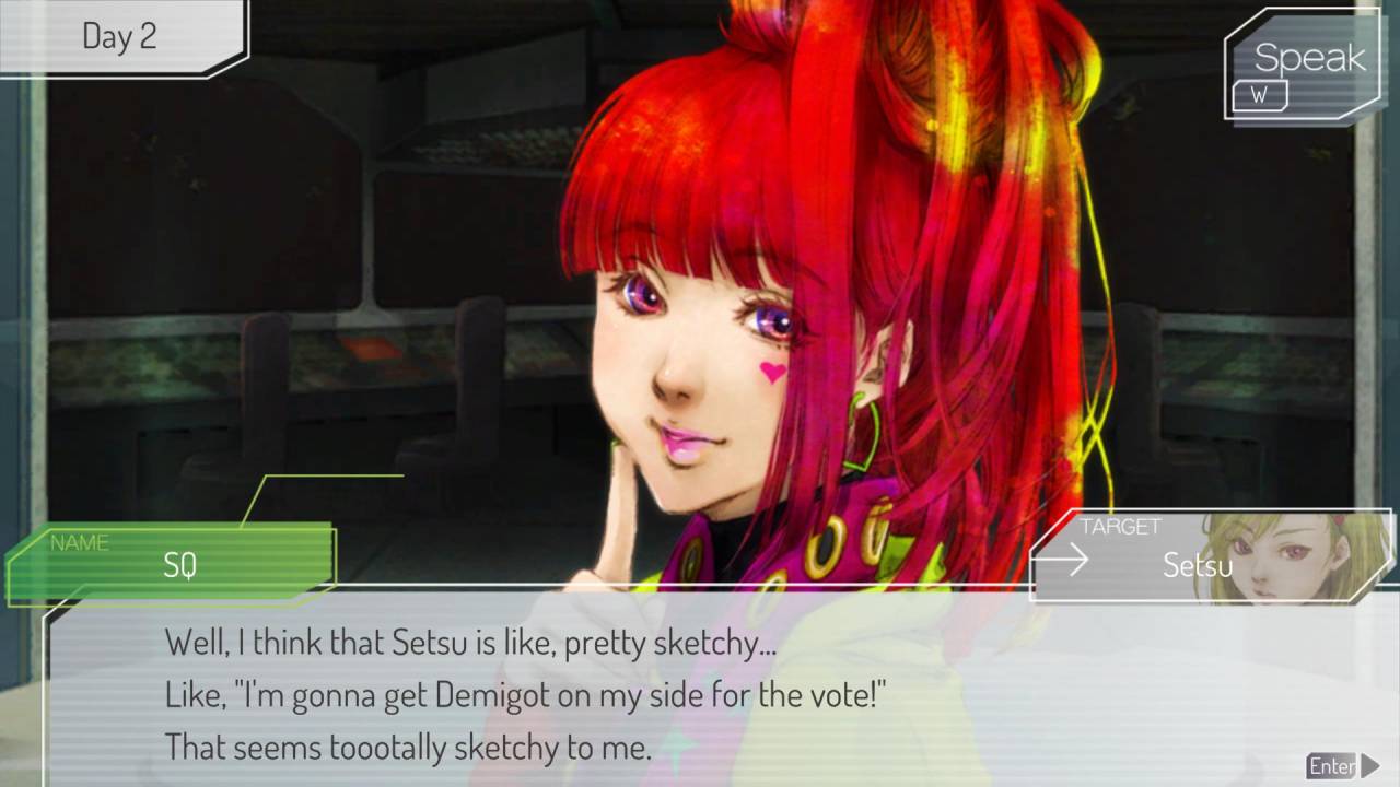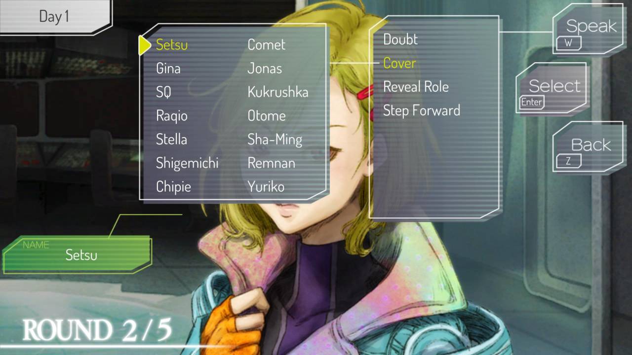 Например, однажды симпатичная девушка по имени Сэцу позвала меня к себе в комнату и предложила быть друзьями (здесь можно формировать временные альянсы, чтобы поддерживать друг друга во время обсуждения перед голосованием), а через какое-то время призналась, что является Gnosia, — то есть фактически предложила взять роль последователя чужака (AC Follower). И тут мы уже решаем, согласиться или нет.