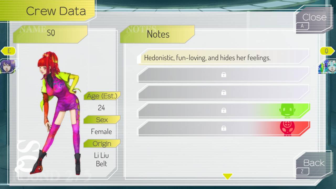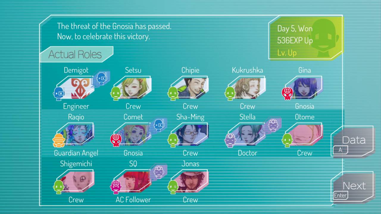Деталей в Gnosia, на самом деле, ещё много. И тут важно сказать, что подаётся это всё как визуальная новелла для одиночного прохождения. То есть все остальные персонажи заранее прописаны. В каждом цикле они случайно меняют роли, что влияет на их действия, слова и мотивацию, но в своей основе они остаются всё теми же — со своими характером и особенностями, которые мы постепенно раскрываем.