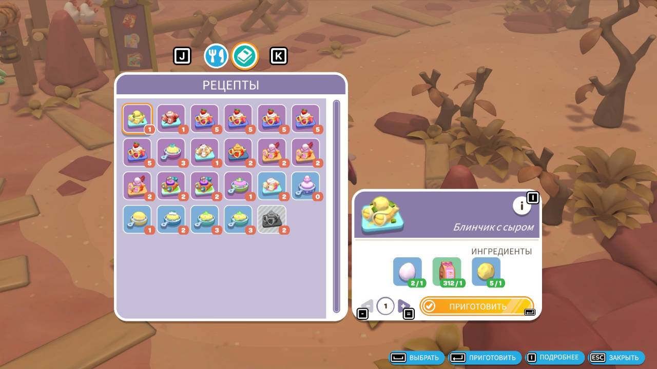 На верстаке создаётся абсолютно всё — от сувениров, книг и одежды до техники и мебели, но для всего этого нужны чертежи и достаточное количество ресурсов. Чертежи спрятаны по всему острову, а также даются в качестве награды. Делать можно не только вещи, но и еду. Базовая готовка — это выпечка. И в отличие от крафта, блюдо можно приготовить даже без рецепта, соединив правильные ингредиенты в духовке. Потом также откроются печь для пиццы, кофемашина, сковорода и автоматы с газировкой и десертами. Готовка не по найденным рецептам, а по наитию — залипательное занятие. Не знаю, говорит ли во мне моя природная страсть к кулинарии, но чувство, когда смешиваешь ингредиенты и у тебя получается новое блюдо, невероятно приятное! А ещё большее удовольствие — открыть таким образом все рецепты.