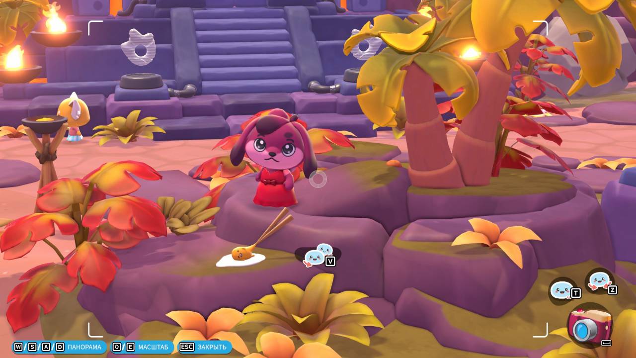 Даже если не увлекаться кулинарией, крафтом и выполнением заданий, само по себе исследование острова весьма занимательно. Карта тут огромная и состоит из нескольких биомов — есть как традиционные для такого места тропические пляжи с коралловым рифом, так и внезапные Жуткое болото и Самоцветная гора, ну и куда более неожиданные локации, открывающиеся на поздних этапах. По всему острову разбросано множество сундуков, отдыхающих гудетам (антропоморфных яичных желтков, которых надо найти и сфотографировать), нераскрывшихся бутонов, жаждущих того, чтобы их полили из лейки. Есть и пещеры с головоломками — они похожи на святилища из The Legend of Zelda, только попроще. Если продолжать сравнение с «Зельдой» и Breath of the Wild в частности, то стоит сказать, что герой здесь тоже может плавать, карабкаться по горам и ограничен в этих действиях только своей выносливостью. Со временем её можно повышать с помощью золотых яблок.