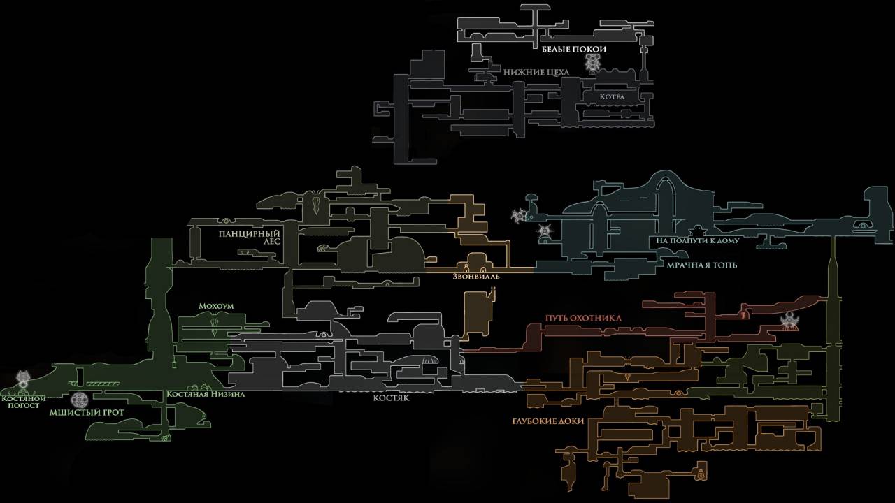 К примеру, «Охотник» — стартовый знак Хорнет, «Жнец» выпадает после боя на арене, «Зверь» достаётся за победу над Дикой Зверомухой, а «Странница» лежит в здании Костяного Помоста, доступ в которое открывают Червоточины. «Архитектор» требует наличия десяти красных инструментов и покупки ключа у одноимённого персонажа. «Ведьма» выдаётся Сизокорнем после того, как вы принесёте ему Искривлённый бутон из Желчноводья. Последний знак, «Шаманка», становится доступным в третьем акте после использования умения «Окрыляющий Шёлк», найденного в Бездне.