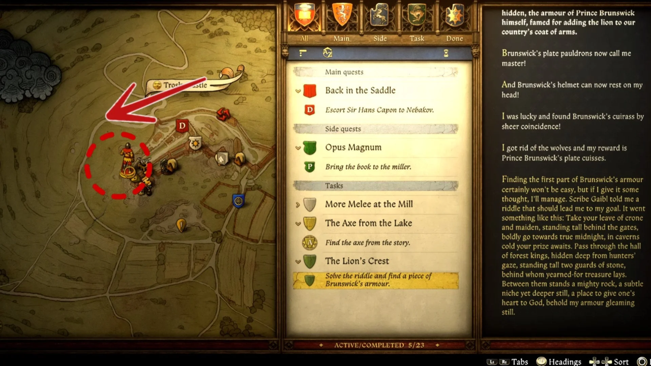 Он расскажет, что некий шляхтич одолжил книгу, и вам нужно будет его найти. Обязательно спросите, где можно найти людей, которые видели шляхтича в последний раз, и это добавит их маркеры на карту. Если не спросить, они не будут отмечены. По желанию можно поговорить с ними, чтобы получить подсказки. Это основной способ получения маркера, указывающего на область поиска шляхтича и книги. Если хотите сэкономить время, можете пропустить дополнительные цели и сразу направиться к местоположению книги.
