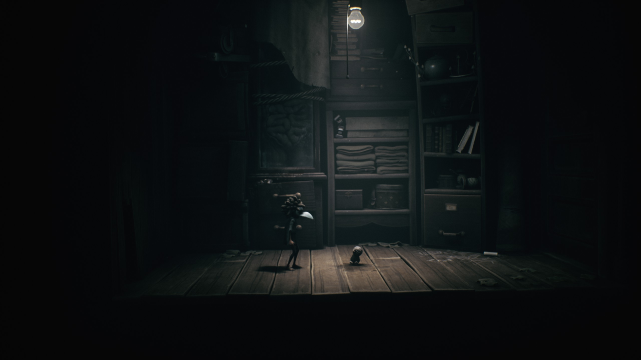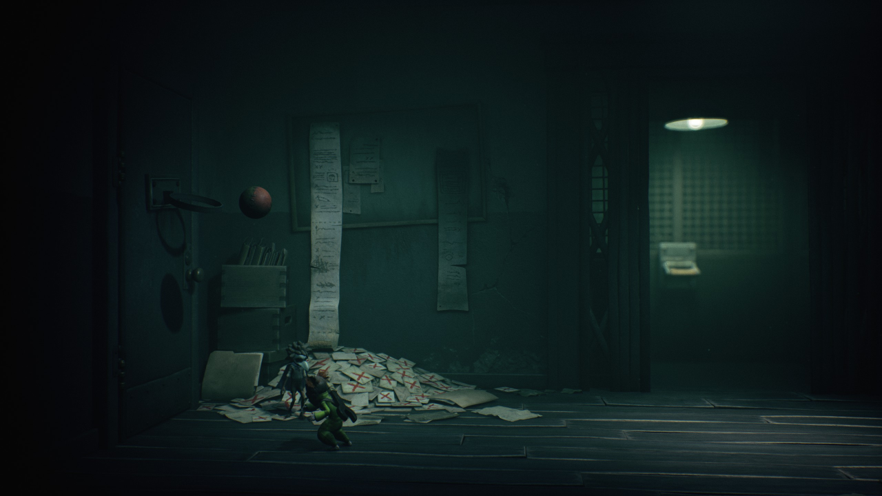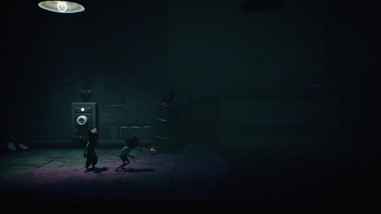 На правой стене комнаты есть кнопка. Вы можете выстрелить в неё, играя за Малого, или бросить в неё мяч, если проходите игру в одиночку за Одну. Так вы выключите свет и сможете выманить из укрытия нома № 5. Следуйте за ним, и вскоре сможете обнять нома в комнате, расположенной по тёмному коридору слева.