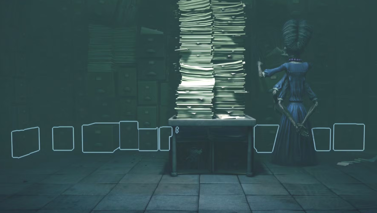 Ещё несколько движений, и она наконец выйдет через дверь с правой стороны, а вы сможете проследовать за ней. Этот путь ведёт в коридор с портретами и стоящей в самом конце передвижной тележкой. Подкатите тележку к стойке с правой стороны и продолжите движение в следующую комнату. Не подходите слишком близко к проводу под напряжением, пока Малой не нажмёт кнопку, чтобы отключить электричество. Следующая комната будет большой, здесь есть несколько картотек. Как и в кабинете ранее, в данное помещение вновь войдёт Начальница, которая будет медленно ходить туда-сюда между левой и правой сторонами. Вам нужно пробраться мимо босса тем же способом, что и раньше: сначала переместитесь к середине комнаты, а затем — к правому дальнему краю, где сразу же обнаружите лестницу.