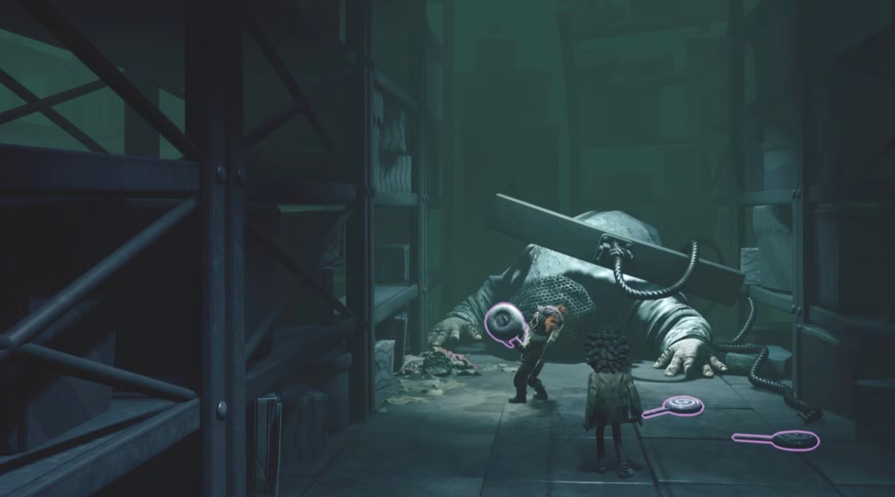 Вскоре после того, как соберёте третью коллекционную куклу, вы наконец доберётесь до комнаты с картотекой. Одному игроку нужно будет открыть нижний ящик, чтобы подтолкнуть другого и добраться до комнаты с несколькими сломанными телевизорами. Отодвиньте монитор на полу в правую сторону, чтобы заблокировать дверь. Теперь, когда оба игрока находятся в помещении, одному из вас нужно подтолкнуть другого, чтобы тот потянул за рычаг и отключил камеры видеонаблюдения. Вернитесь в коридор, где дверь в правой стороне закрывалась каждый раз, когда вы к ней приближались, и на этот раз сможете пройти. Вы окажетесь над другой комнатой, где на мгновение увидите проходящую мимо Начальницу.