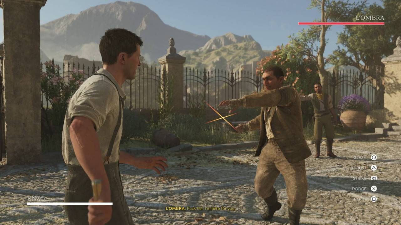 После обучения начинается полноценная дуэль. Лука — простой соперник без особых хитростей, так что сосредоточьтесь на парировании его атак и уклонениях при виде красного индикатора. Не атакуйте без уверенности в том, что удар дойдёт до цели — задача этой схватки в том, чтобы закрепить навыки защиты и контратаки. Победив, садитесь на лошадь и отправляйтесь с Лукой в следующий город. По пути откроется возможность пришпорить лошадь для ускорения (клавиша Q).