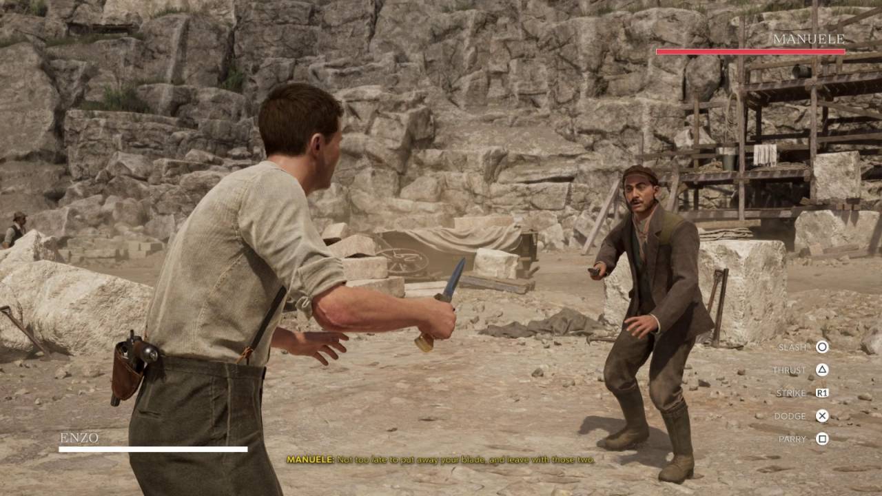 Особое внимание уделяйте комбинации Мануэле с тремя ударами к ряду: низкий срез в область бёдер, затем удар сверху и завершающий неблокируемый удар. Если не сможете парировать один из двух первых, будьте готовы увернуться от последнего. Мануэле предсказуем, поэтому не спешите — дождитесь ошибки, чтобы легко парировать и контратаковать. После победы садитесь на лошадь и отправляйтесь к следующей цели.