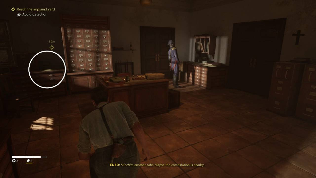 Пройдите в соседнее помещение и после осмотра сейфа соберите несколько записок, в одной из которых содержится кодовая комбинация. Вас интересует записка со стола, после чего вы сможете открыть сейф комбинацией 10-20-30. Забрав содержимое, вернитесь к Луке и Чезаре. Закончив с лимонной фермой, садитесь на лошадь и отправляйтесь с Лукой и Чезаре к карьеру, где началась забастовка — время «разобраться» с профсоюзом.