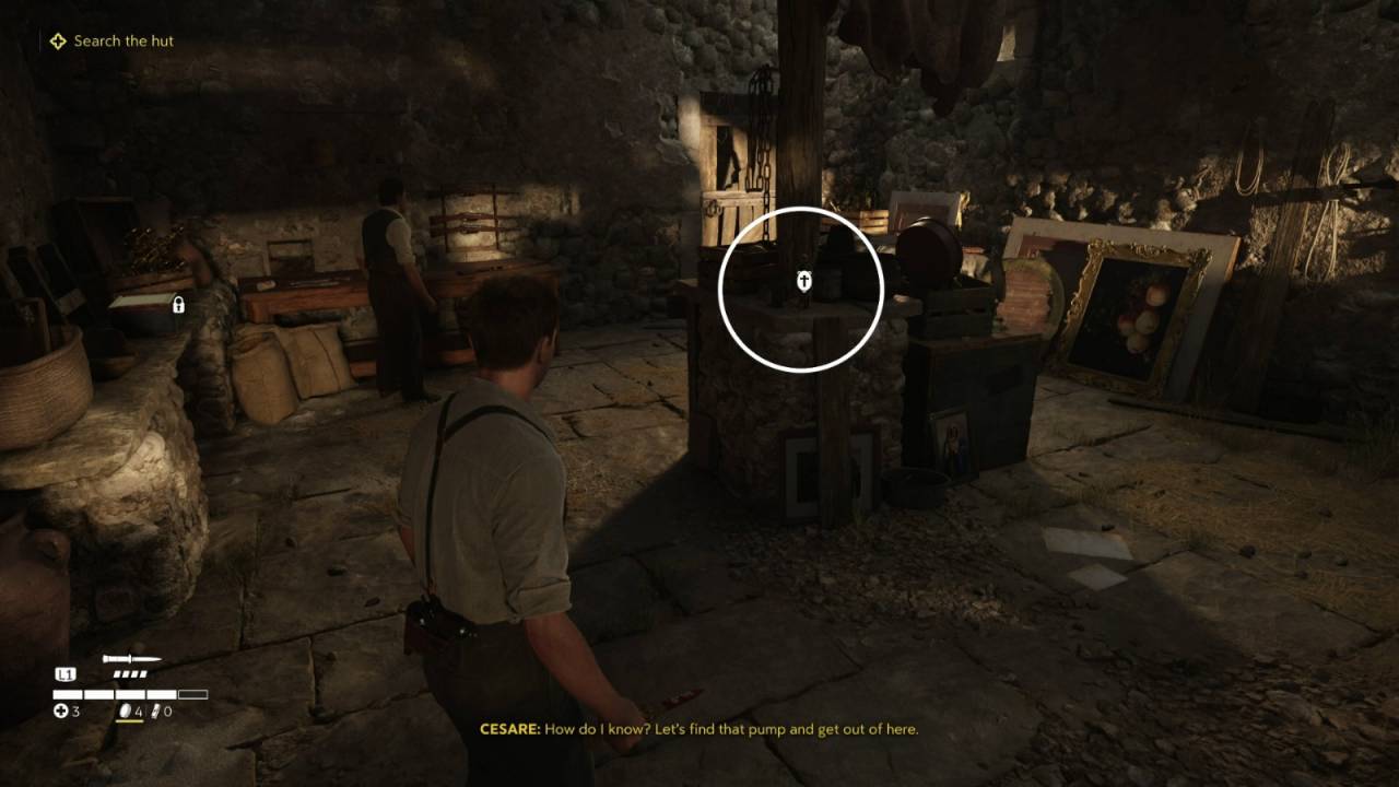 После того как бандиты будут повержены, используйте бинт, чтобы восстановить очки здоровья, и обыщите тела, чтобы пополнить запасы патронов, оселков, бинтов, монет и гранат. Прежде чем войти в хижину с Чезаре, зайдите в разрушенное здание справа — там есть шкатулка с динари. Внутри хижины будет ещё одна шкатулка — используйте нож, чтобы её вскрыть. Скорее всего, к этому моменту прочность ножа будет почти на нуле, поэтому возьмите оселок с ближайшего стола, с левой стороны от шкатулки с динари. Чтобы его заточить, просто экипируйте нож клавишей «3» и нажмите на клавишу/кнопку перезарядки (на ПК это R).