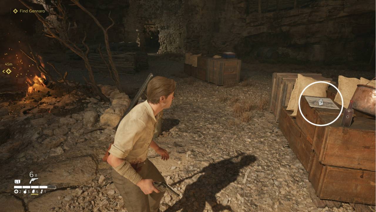 Если у вас остались гранаты, самое время пустить их в ход — люди Мессины часто собираются группами у костров. Используйте это себе на пользу. Как только перехватите управление Энцо, перед вами будет лежать талисман Fantasma, снижающий шум от ваших шагов. Если планируете проходить лагерь по стелсу, он будет максимально полезен.