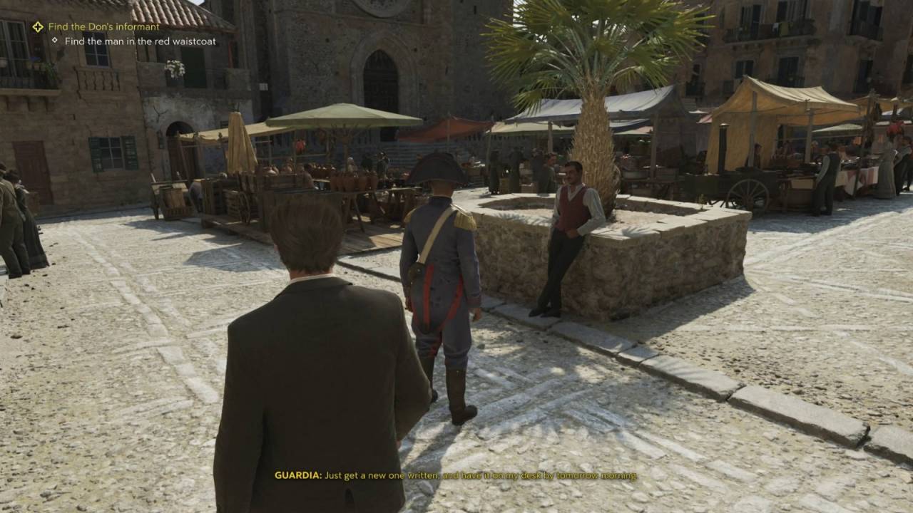 После выхода из автомобиля поднимитесь по лестнице и продолжите движение в сторону рыночной площади. Когда подойдёте, начнётся кат-сцена. Оказывается, Изабелла и Валентина тоже приехали в город за покупками. Теперь нужно войти на рыночную площадь и найти информатора. Известно только, что это мужчина в красном жилете…, но таких здесь несколько. Нужный вам человек находится в глубине площади, справа от точки входа. Когда подойдёте, он будет разговаривать с представителем правопорядка. Дождитесь, пока тот уйдёт, и только потом начните беседу. Пока ждёте, можно заглянуть к стене напротив — на столе под плакатом Targa Siragusa лежит записка.
