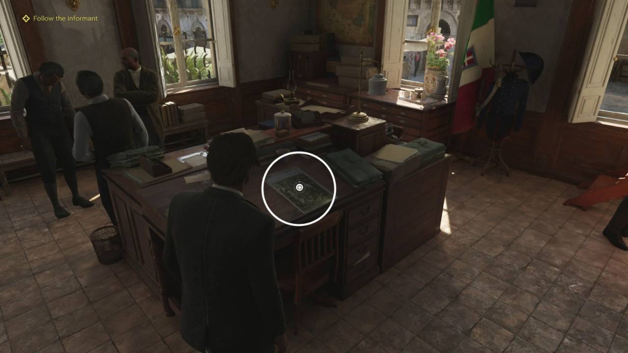 Теперь можно зайти в главный офис напротив. Откройте дверь справа — внутри будет сейф. На столе слева лежит записка, а на столе рядом с сейфом — ещё одна, благодаря которой Энцо подберёт комбинацию (28-34-12). Здесь же на столе есть шкатулка с замком. Внутри сейфа лежит записка с информацией, что клише перенесли в сейф Д’Амико, а также код от него и 300 динари. Вернитесь в главный офис со столами и обыщите его: можно найти ещё три записки, включая два отчёта об арестах и заметку на одной из досок с бумагами. В конце коридора есть небольшой кабинет с охранником — устраните его. Внутри лежат три записки, среди которых код от другого сейфа. Пройдите через две двери впереди, чтобы добраться до него. Слева на столе — шкатулка с замком, а рядом с сейфом — ещё одна записка. Откройте сейф при помощи найденной комбинации (00-01-02) — внутри ещё 300 динари.