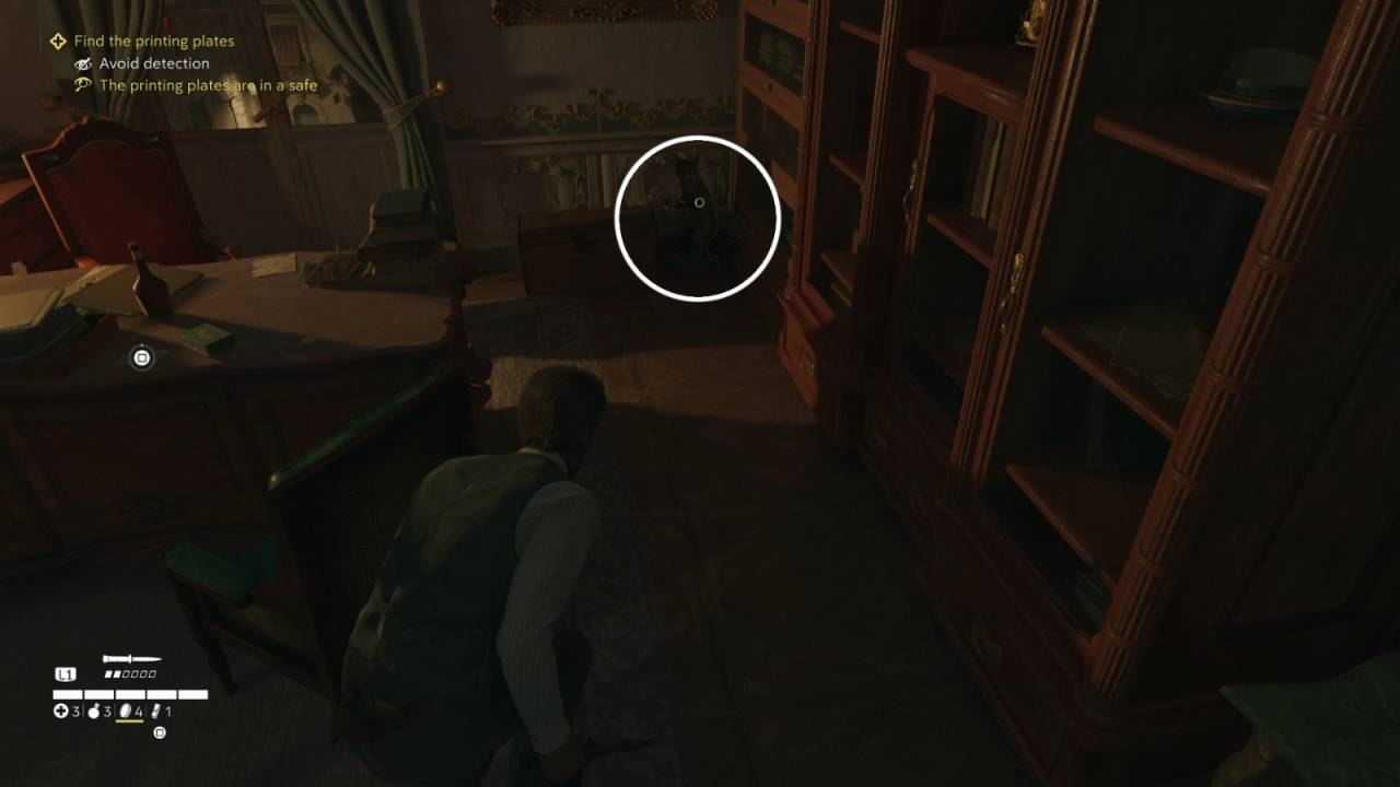 Далее вернитесь в холл и откройте дверь напротив лестницы. Перед ней патрулирует стражник — ликвидируйте его. Внутри находится сейф с печатными клише, талисман Acuto, а также несколько записок с кодом от сейфа (если вы его не получили ранее). Откройте сейф и заберите клише, после чего начнётся кат-сцена.