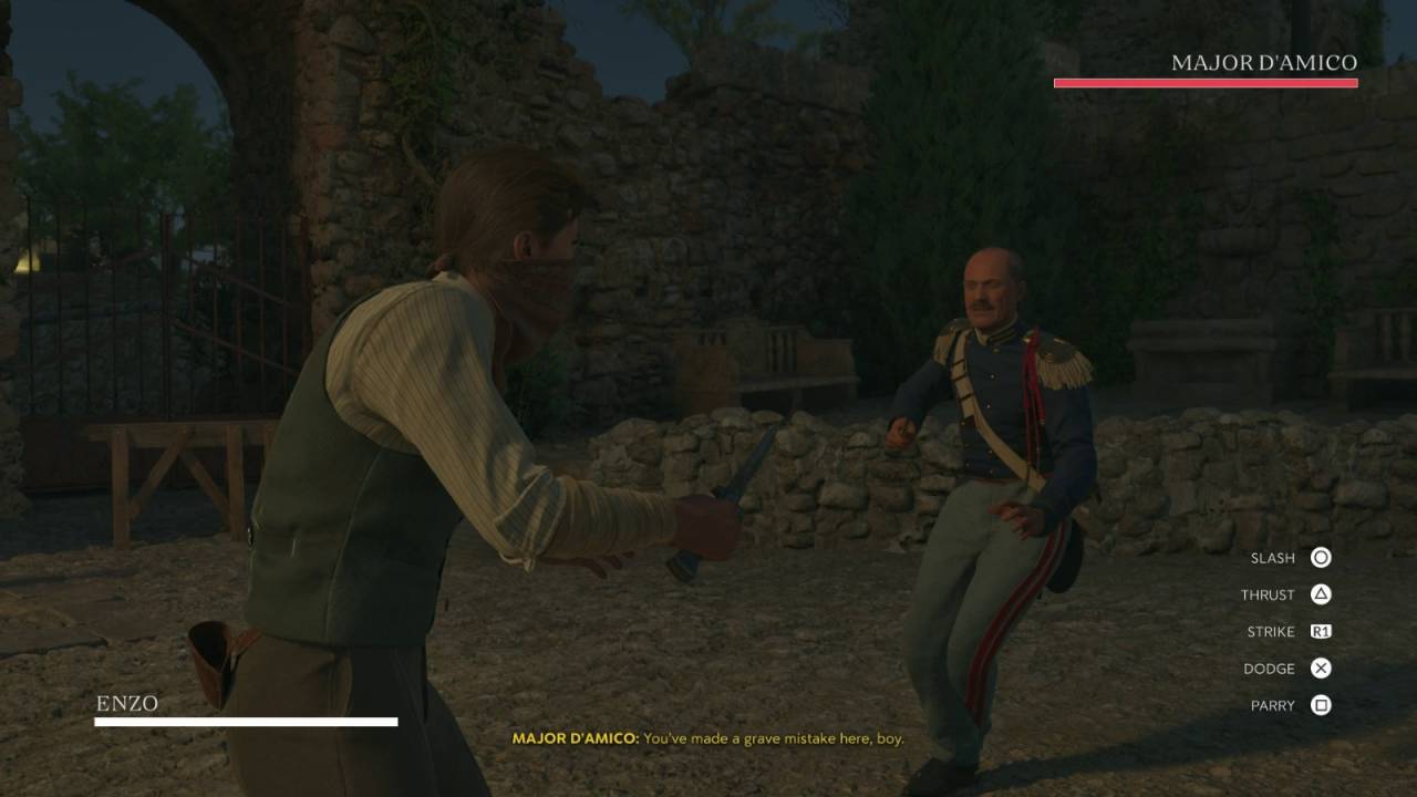 Этот поединок сложнее прошлых, но приёмы вам уже знакомы. Противник использует финт: делает вид, что атакует, быстро отводит нож, а затем наносит настоящий удар — так же, как Мессина в четвёртой главе Il Barone. Он часто проводит короткие серии из 3-4 ударов, комбинируя рубящие, колющие и тяжёлые атаки. Обычные удары парируйте, а от тяжёлых (когда клинок загорается красным цветом) только уклоняйтесь. После успешного уклонения или парирования сразу отвечайте выпадом или рубящим ударом — если действовать быстро, попадание почти гарантировано. Когда нанесёте достаточно урона, кат-сцена завершит бой и откроет новую цель.