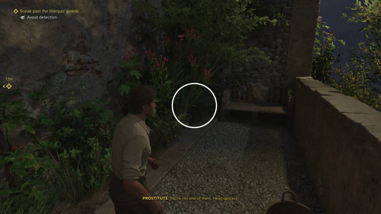 После этого вы окажетесь в ночном Сан-Челесте. Следуйте за Лео, и, подходя к борделю, он расскажет план — нужно сделать компрометирующие фотографии маркиза Сирагусы. У входа вас встретит его контакт. Женщина скажет, что цель находится внутри, но двор охраняют телохранители маркиза. Они расположены в разных его частях. Сразу при входе поднимитесь по лестнице слева. Наверху тихо оглушите первого охранника. Далее идите по узкому верхнему проходу. В конце появится Лео, который отвлечёт ещё одного стража — можете его ликвидировать. Отсюда можно либо сразу перейти во двор напротив через открытую дверь, либо устранить оставшихся охранников (совершенно необязательно).