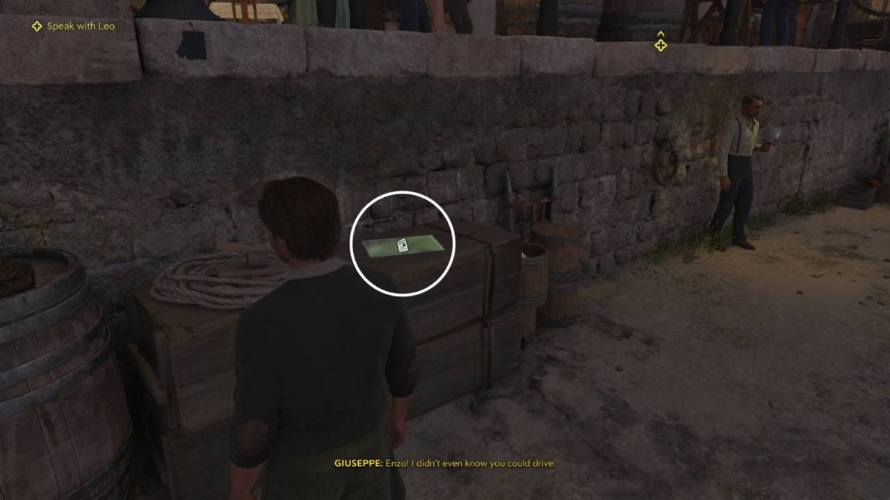В начале главы вы окажетесь на складе на причале возле Порто-Альмаро, а Лео и Чезаре выйдут на улицу. Перед уходом осмотрите левую стену — там есть шкатулка с замком и талисман Astuto. В боковой комнате с машинами находится ещё одна шкатулка с замком. Снаружи Лео отведёт вас к ряду гоночных афишу и предложит принять участие. Вскоре из гаража выкатят гоночный автомобиль. Нужно подойти и осмотреть его. Садитесь в машину, буксирующую гоночный болид, и отвезите его по маркеру. Вы попадёте на заправку Паскуале. По прибытии выйдите из машины и поговорите с Паскуале.