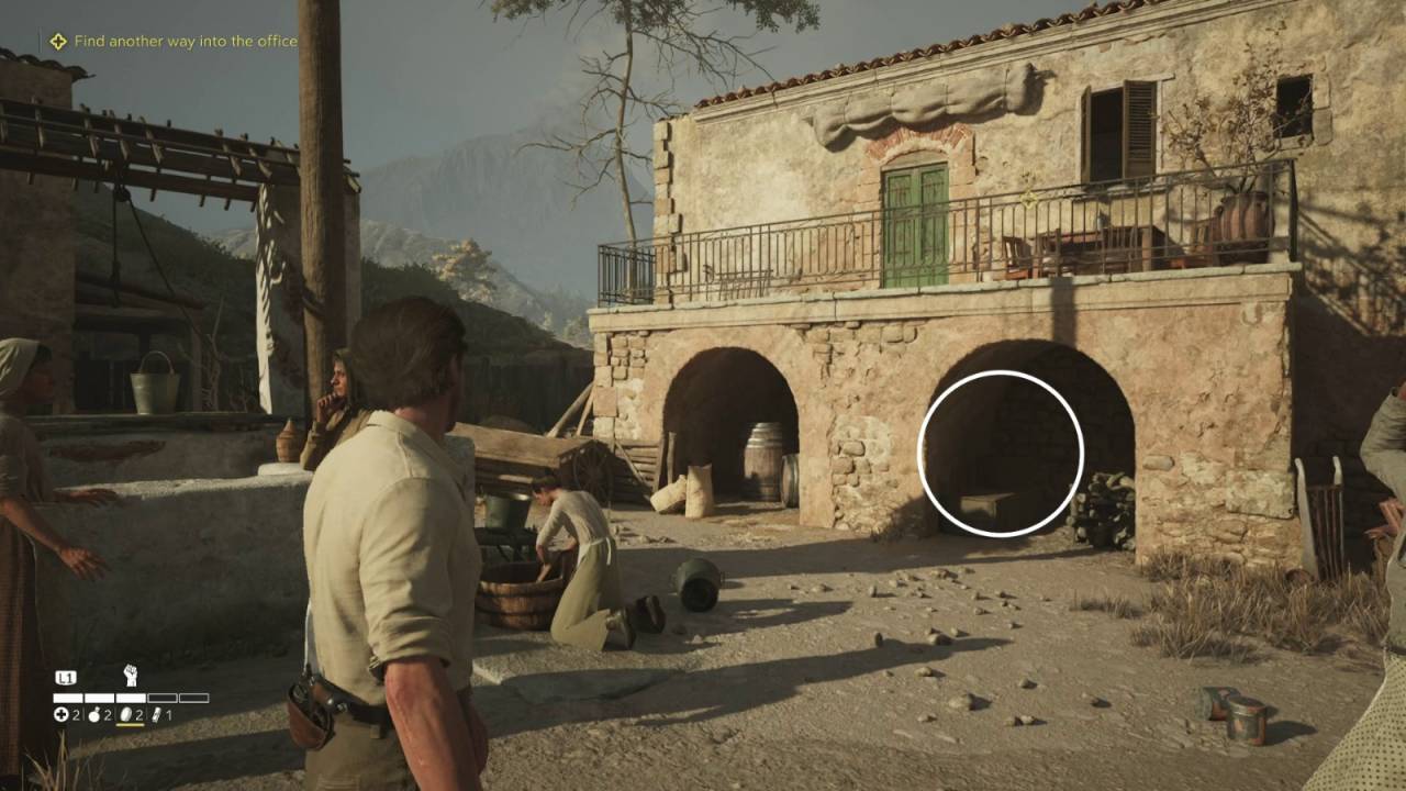 В Колледзольфо (если вы общались с Паскуале) появятся два необязательных маркера. Сначала идите налево, чтобы поговорить с любовницей Лоренцетти, затем направо — к Камилло. После разговоров с ними появится новый маркер. Отправляйтесь к нему, чтобы найти играющих в карты Тонио и Себастьяно, и поговорите с ними. Поднимитесь по близлежащему холму к офису. Если попробовать подняться по лестнице обычным способом, окажется, что дверь заперта. Придётся искать обход. Спуститесь обратно и обойдите здание.
