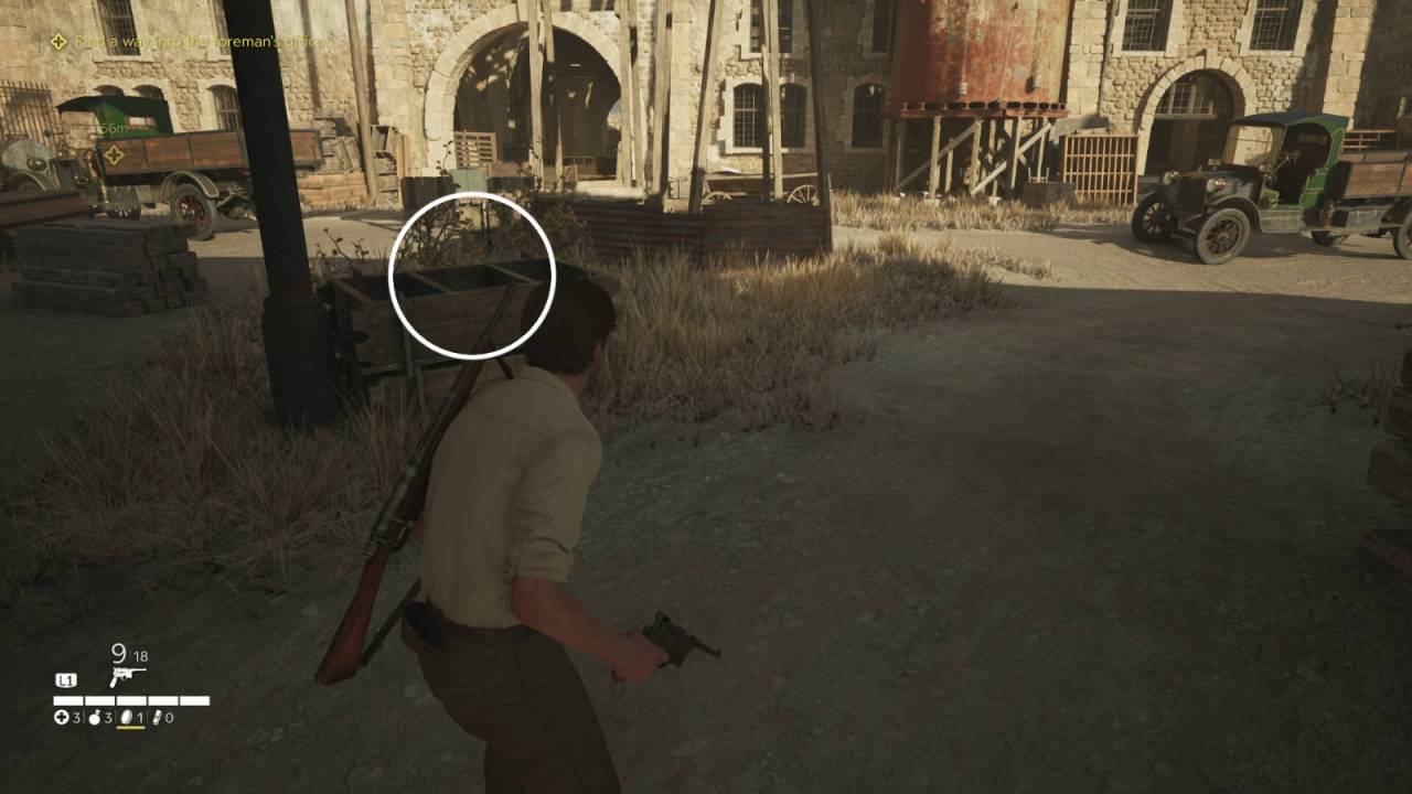 Путь через ворота справа — самый безопасный, так что выберите его, если хотите получить достижение. Пройдя через пролом в заборе, вы встретите охранника. Подкрадитесь и устраните его, а затем откройте ворота. Внутри, с левой стороны будет ещё один страж, а у входа на фабрику — патрулирующий охранник. Нужно убрать обоих. Ближайший не составит проблемы, а до патрульного лучше подобраться тихо, используя как укрытие штабеля древесины.