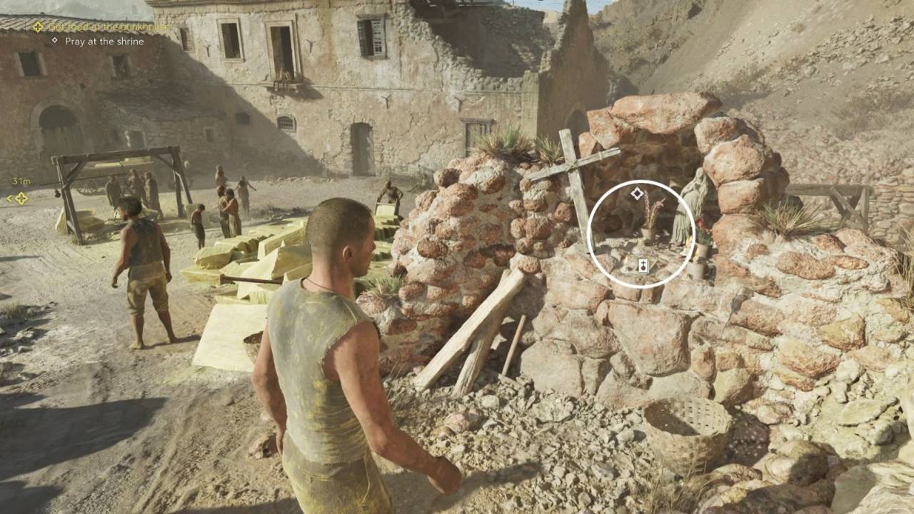 Возле барака можно прочесть пару записок, которые попадут в дневник: одна лежит перед автомобилем с правой стороны, вторая висит на стене рядом с дверью. Для продолжения подходим к палатке, где готовят еду, и говорим с Игнацио. После короткой беседы цели обновятся.