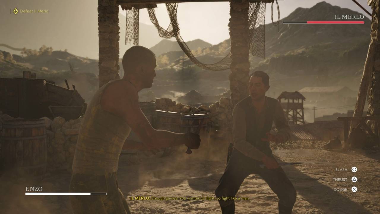 После кат-сцены пролезьте через узкий проём и продолжите движение за напарником. По пути появятся новые подсказки: например, о том, как перелезать через препятствия. Поднявшись по двум лестницам, попадём в более оживлённую часть шахты. Держимся проложенного маршрута, пока не встретится новый персонаж — Иль Мерло. После видеоролика Энцо возьмёт на спину корзину с рудой. Следуем за Гаэтано, пока он не выведет нас из шахты на поверхность.