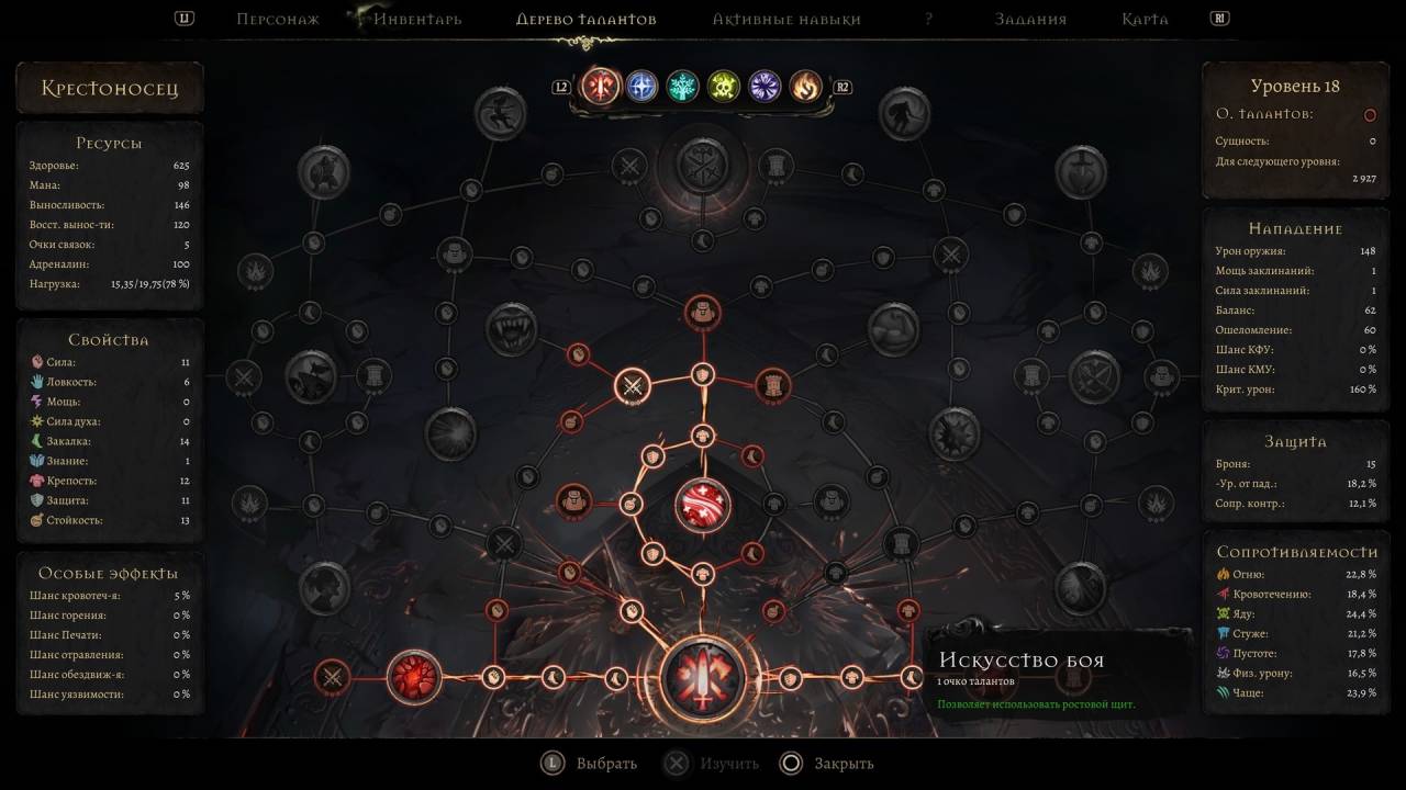 Поначалу древа выглядят пугающе и напоминают о Path of Exile, но потом понимаешь, что главное в них — кружочки, открывающие уникальные пассивные бонусы. Например, я играл за крестоносца, и среди его «улучшалок» есть восстановление здоровья при убийстве, повышенный урон по тяжелораненым противникам и шанс наложить кровотечение. Тень учится находить у оппонентов слабые места и создавать ядовитые лужи под отравленными противниками, у судии (да, класс так называется) бонусы связаны с защитным барьером света, у егеря — с духами зверей, и так далее.
