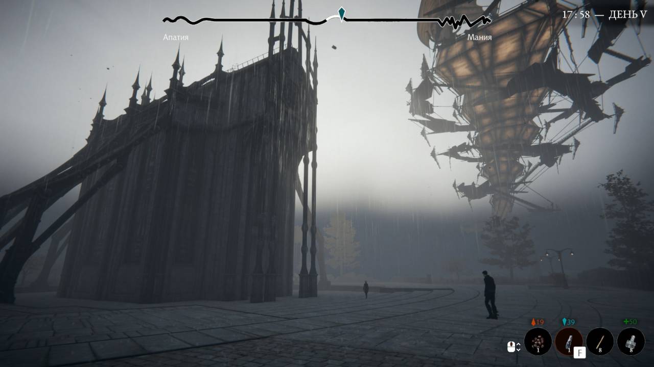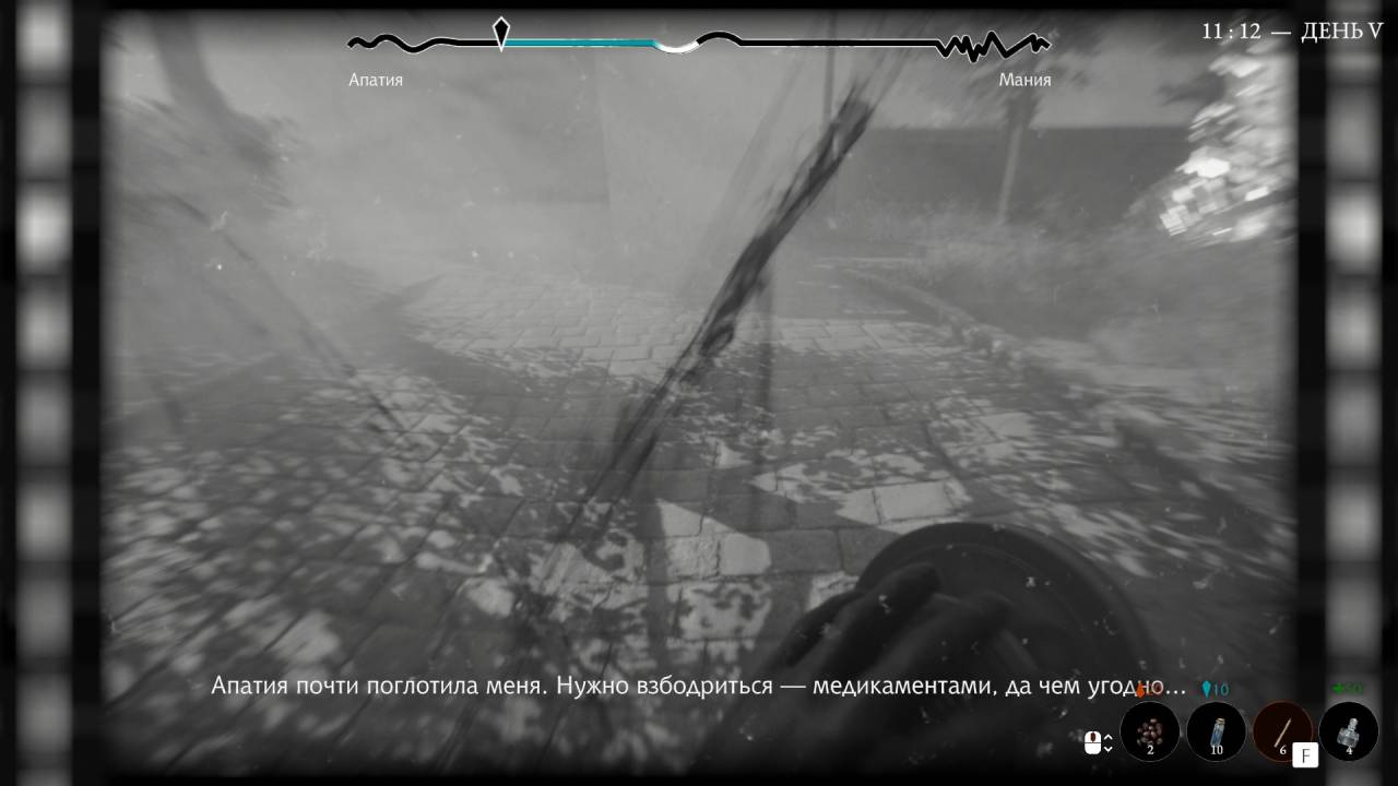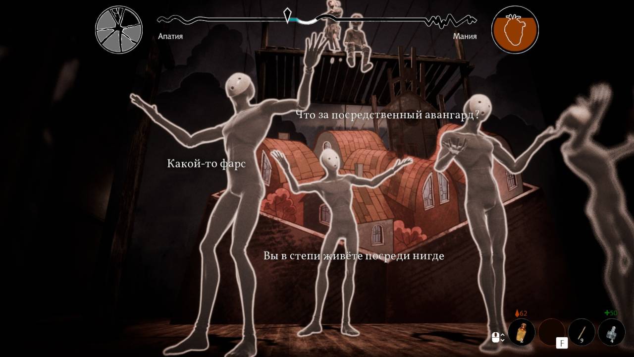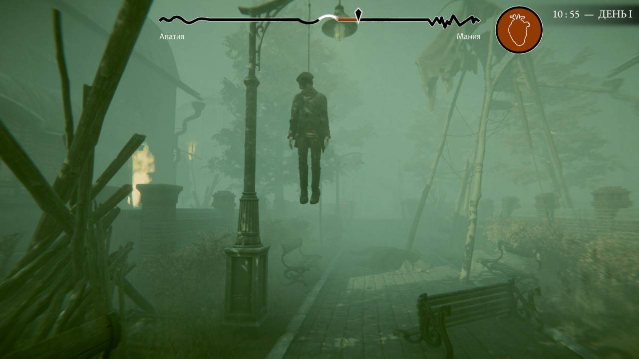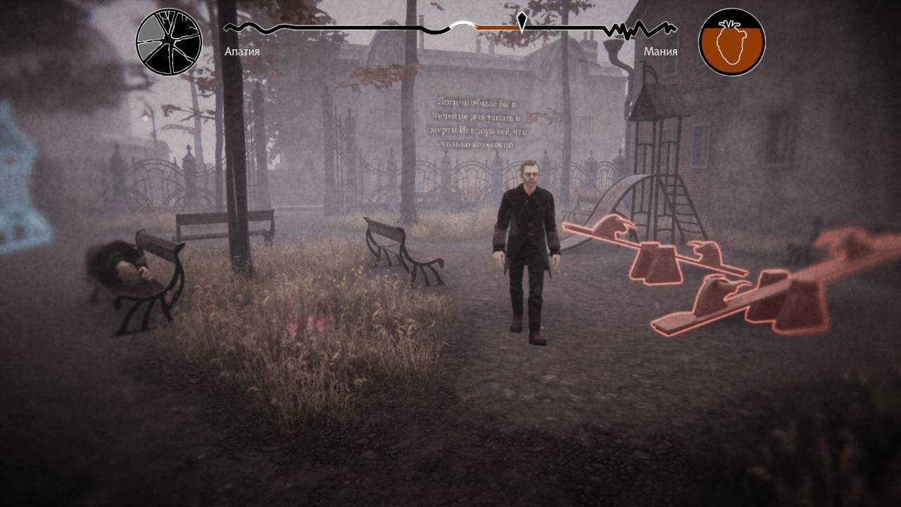 Тут на сцену местного театра выходит самая спорная механика, появившаяся в Pathologic 3, — система мании и апатии. Бакалавру в новой игре не нужно следить за голодом, сном и иммунитетом. Главное — контролировать, чтобы шкала душевного равновесия вверху экрана не уходила слишком сильно влево или вправо. Чем больше влево, тем больше он подвержен апатии и начинает двигаться медленнее, чем больше вправо, тем больше учащается пульс, персонаж начинает двигаться быстрее, но и здоровье его тает, как при кровотечении.