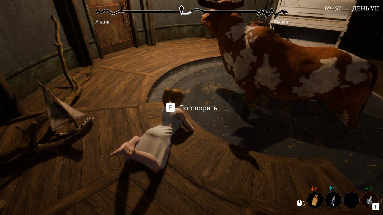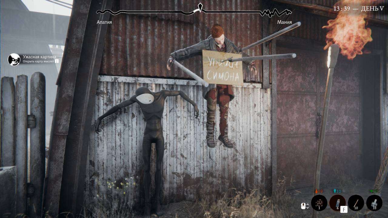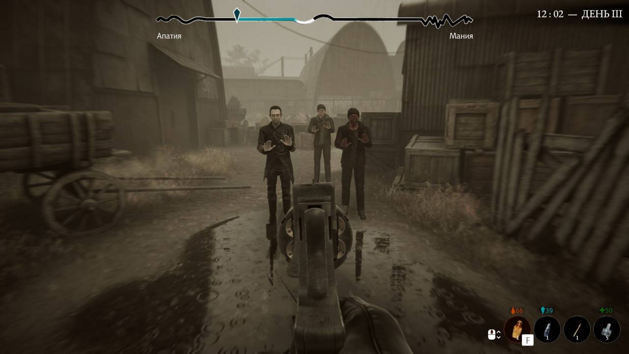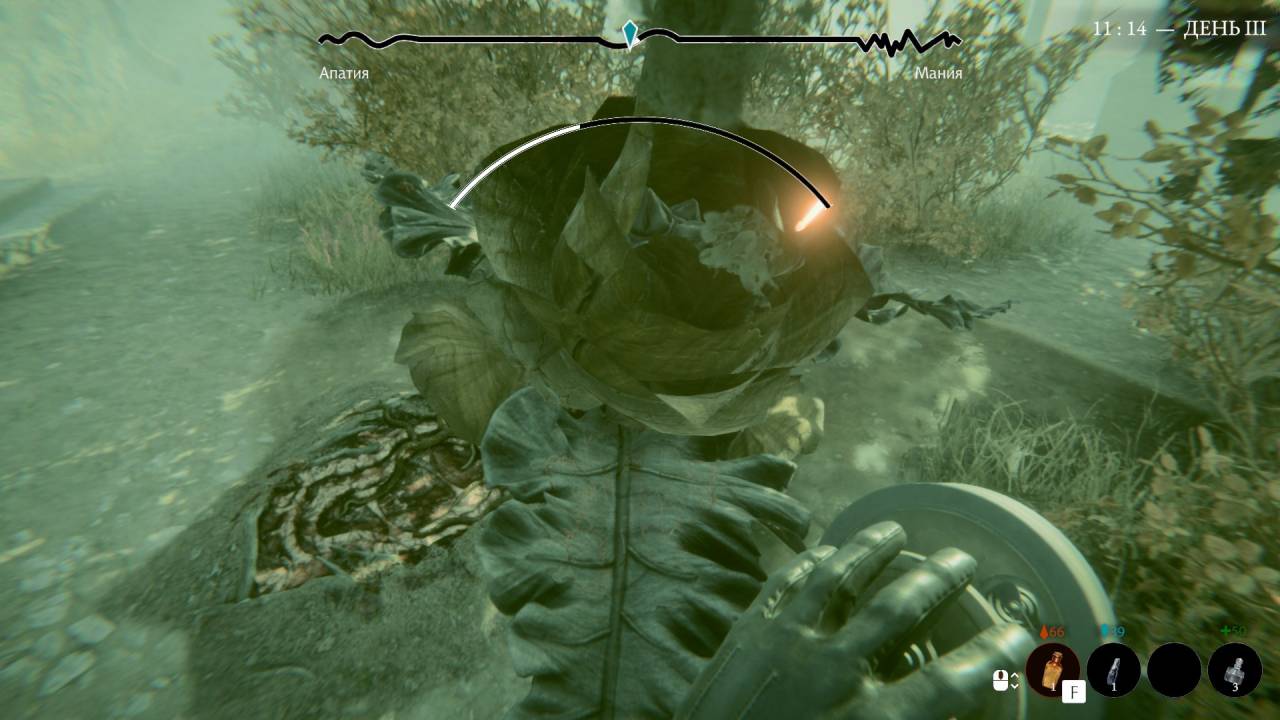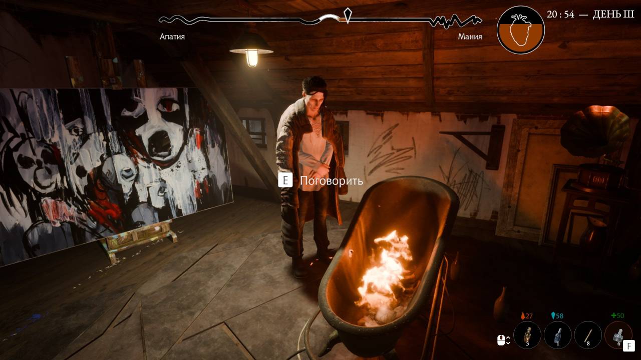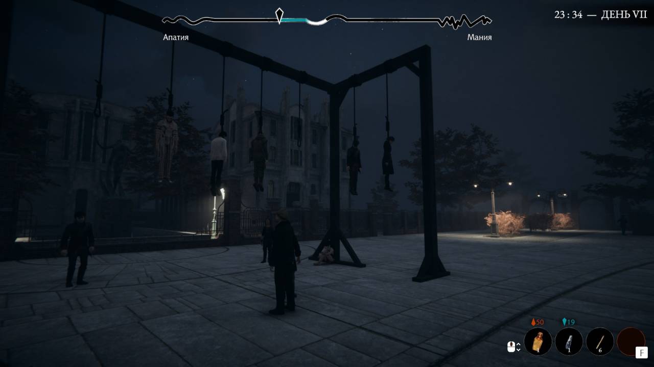 Тут на сцену местного театра выходит самая спорная механика, появившаяся в Pathologic 3, — система мании и апатии. Бакалавру в новой игре не нужно следить за голодом, сном и иммунитетом. Главное — контролировать, чтобы шкала душевного равновесия вверху экрана не уходила слишком сильно влево или вправо. Чем больше влево, тем больше он подвержен апатии и начинает двигаться медленнее, чем больше вправо, тем больше учащается пульс, персонаж начинает двигаться быстрее, но и здоровье его тает, как при кровотечении.