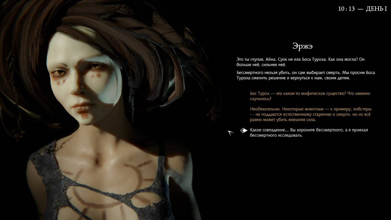 Но проблема в том, что это именно рассуждения гейм-дизайнеров, в которых чувствуется сухой концепт, но не живой нерв игры. Да и театральщина в уже третьей игре по «Мору» скорее утомляет. И когда Марк Бессмертник или сам Бакалавр начинает рассуждать что-то про «иммерсив» и слом «четвёртой стены», это воспринимается как шутка, повторённая трижды, — то есть особо не воспринимается.