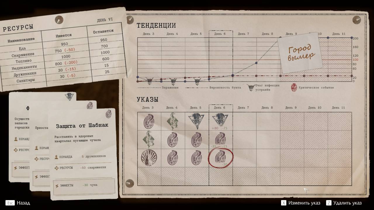 С указами тоже всё серьёзно. Нам раз и практически навсегда выдают запас лекарств, топлива, снабжения, дружинников и санитаров, и каждый указ на каждый день расходует то или иное их количество. Можно вводить карантин, комендантский час, проводить дезинфекцию, фильтровать воду, использовать непопулярные меры вроде принудительной конфискации лекарств или еды. Самое важное и затратное — указы о вакцинации, которые становятся возможны, если мы правильно ставим диагноз трём больным в госпитале.
