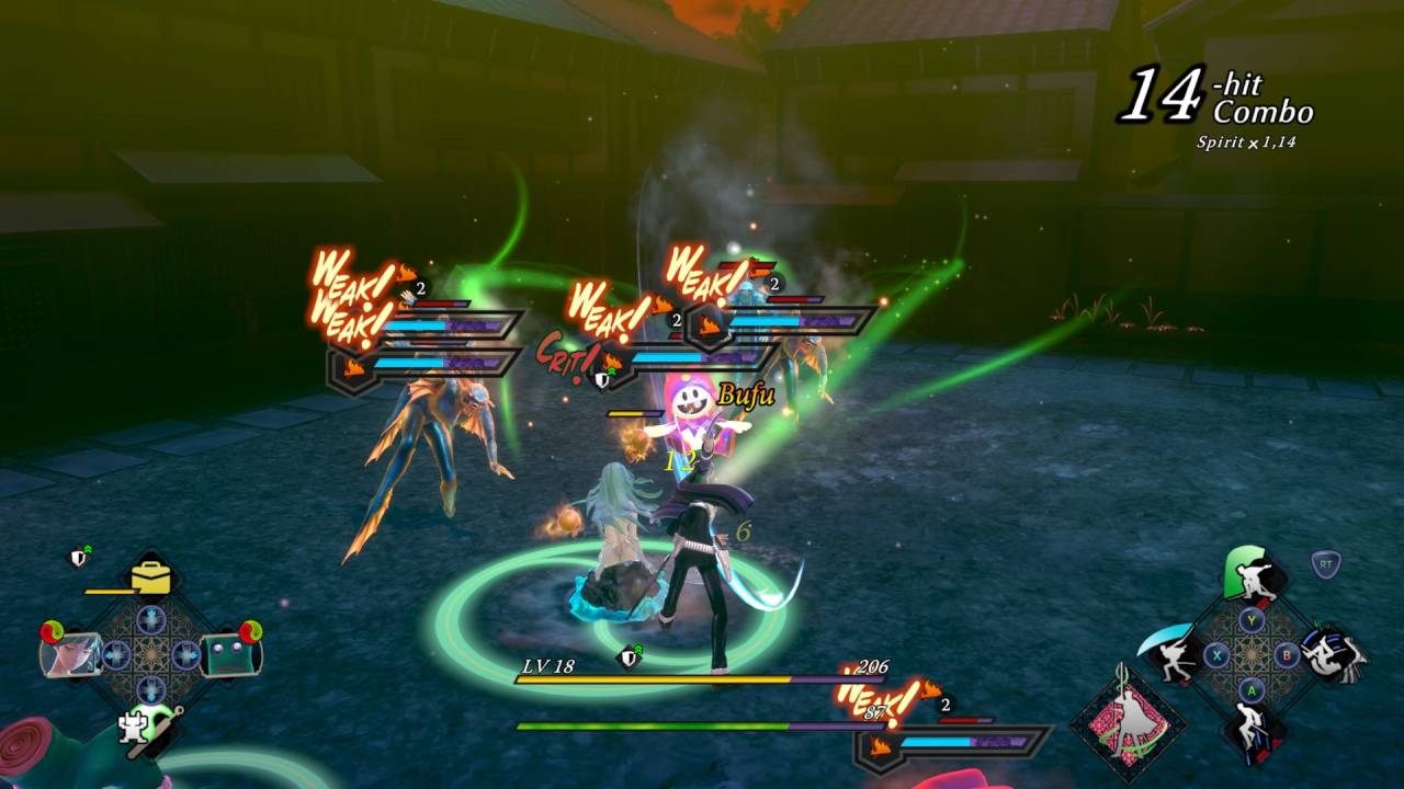 SMT и Persona славятся пошаговой боевой системой, а в этой игре драки происходят в реальном времени. Вас запирают на небольшой арене с несколькими противниками, дают в руки меч и просят всех победить. Среди врагов есть десятки демонов, знакомых фанатам вселенной: Джек Фрост с его широкой улыбкой, летающий в железном горшке Агатион, обворожительная Альп и многие другие. Почти всех этих демонов позволяют завербовать, чтобы они дрались на стороне Райду, и при желании можно сразу же после вербовки их призвать в том же бою. В оригинале с игроком на одной арене сражался лишь один демон, а теперь их может быть двое.