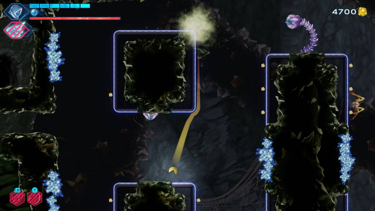 Иногда разработчики решают разбавить привычный геймплей метроидвании и вспоминают о том, что это игра о Пакмене. Периодически во время исследования натыкаешься на рельсы (которые сперва ещё включить надо) — приближаешься к ним, и персонаж автоматически трансформируется в Пака, который «приклеивается» к рельсу и начинает по нему ехать. С характерным звуком, знакомым с детства, здешний Пакмен поглощает местную валюту, а если ему надо кого-то победить, то на долю секунды превращается в Номер 8, машет мечом и «примагничивается» обратно. Это забавно, но такие эпизоды слишком далеко расположены друг от друга — будто изначально их вообще в игре не было. Отдельные испытания, похожие на классические Pac-Man, приносят куда больше удовольствия, но открываешь их далеко не сразу.