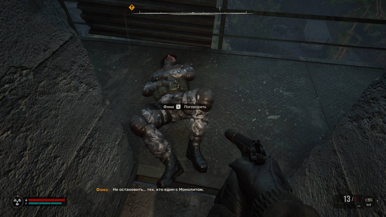 Пройдите через первое здание, выйдите на другую сторону и загляните во второй объект. Учтите, что вам будут мешать зомби-монолитовцы. Внутри следующего здания нужно подняться наверх по лестнице, с металлических платформ спрыгните на открытый контейнер. Вы не сможете открыть небольшой контейнер, в котором оборудован офис, так что поднимитесь выше и карабкайтесь по жёлтой лестнице на крышу. Идите вправо и спрыгните на трубы сбоку от здания, где валяется труп Севера. Обыщите его, чтобы получить ключ. По желанию можете вернуться в тот самый офис во втором здании и открыть дверь, чтобы найти незначительный лут и записку Севера на столе (о том, что поклонники Фауста установили алтарь Монолита).