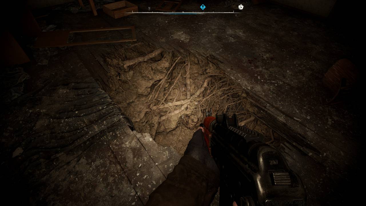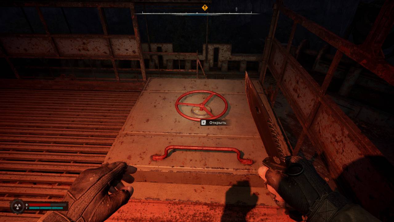 В конце концов, вы окажетесь снаружи. Следуйте по маркеру через заброшенную деревню. На мини-радаре появятся «белые крестики». Они указывают на мертвецов с лутом. Как только вы их обыщите и заберёте добычу, маркер исчезнет. Поднимитесь по любой лестнице на крышу бункера и найдите в середине красные вентиль. Поверните его, чтобы спуститься внутрь.