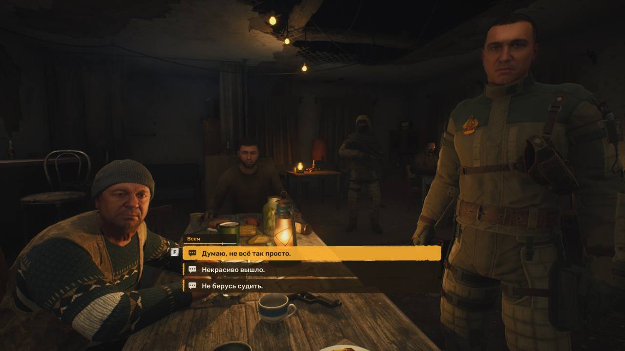 Когда будете готовы продолжить, войдите внутрь бара, чтобы увидеть кат-сцену. Капитан Зотов пришёл с претензиями к Бате и обвиняет Косого в расстреле трёх раненных бойцов.