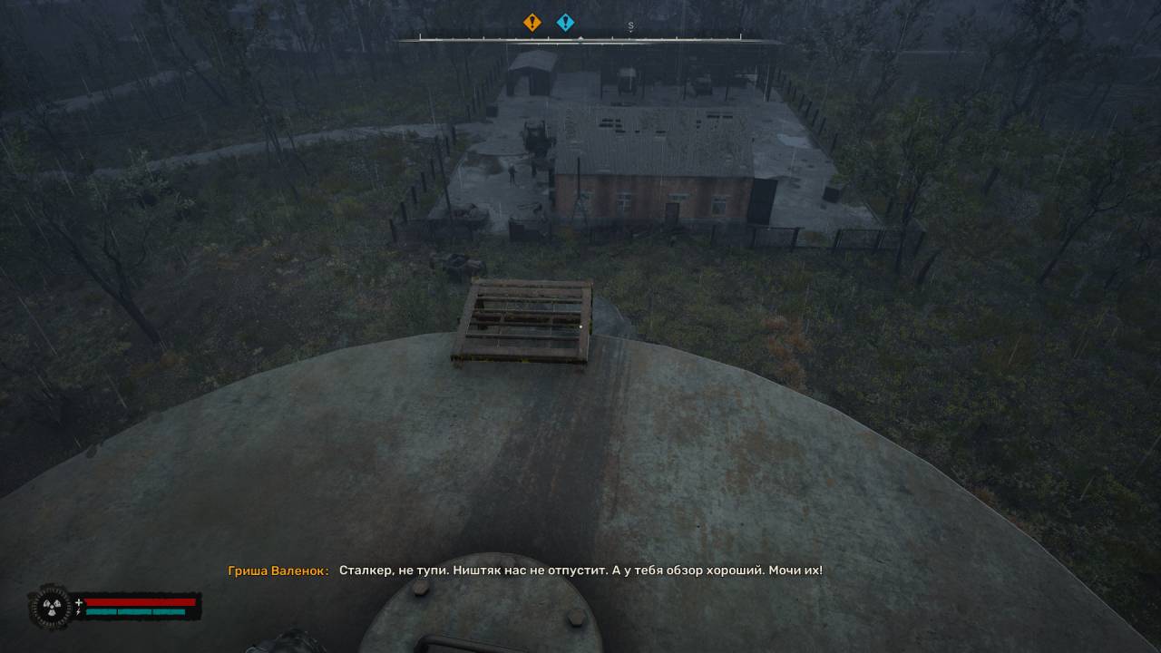 Квест можно взять на территории Залесья в Малой Зоне, пообщавшись с барменом Колдуном. Отправляйтесь по маркеру. Квест можно пройти разными способами, но я пойду самым оптимальным. Итак, при подходе к дому Гришки вы увидите четверых бандитов, и один из них заговорит с вами. Согласитесь ему помочь. Обойдите здание справа, чтобы через окно пообщаться с Гришкой. Выберите первый вариант, скажите, что вы пришли от Колдуна, и он укажет на водонапорную башню. Так вы узнаете за схрон Гришки Валенка.