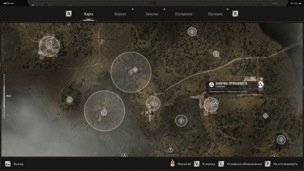 Сталкерская заначка. Тайник расположен на севере Затона, на локации под названием Рыбхоз. Схрон может носит другое название, поскольку генерируется случайным образом. В этом месте вы обнаружите две бандитские группировки, и локацию придётся зачистить. В здании слева заперты сталкеры. Поговорив с ними, можно начать квест Ключ к свободе. Ключ, к слову, расположен на крыше здания, в дальней части, внутри сумки, подвешенной на столб. Тайник же находится в большом здании Рыбхоза справа. Пройдите внутрь, обойдите стеллажи. Где нужно, перепрыгните ящики и лодки, избегайте электрические аномалии. Заберите обычные припасы из сумки.