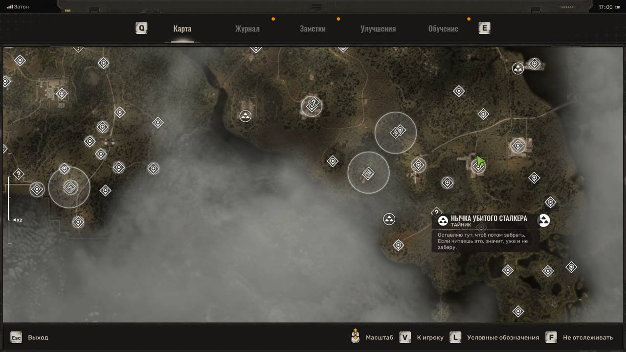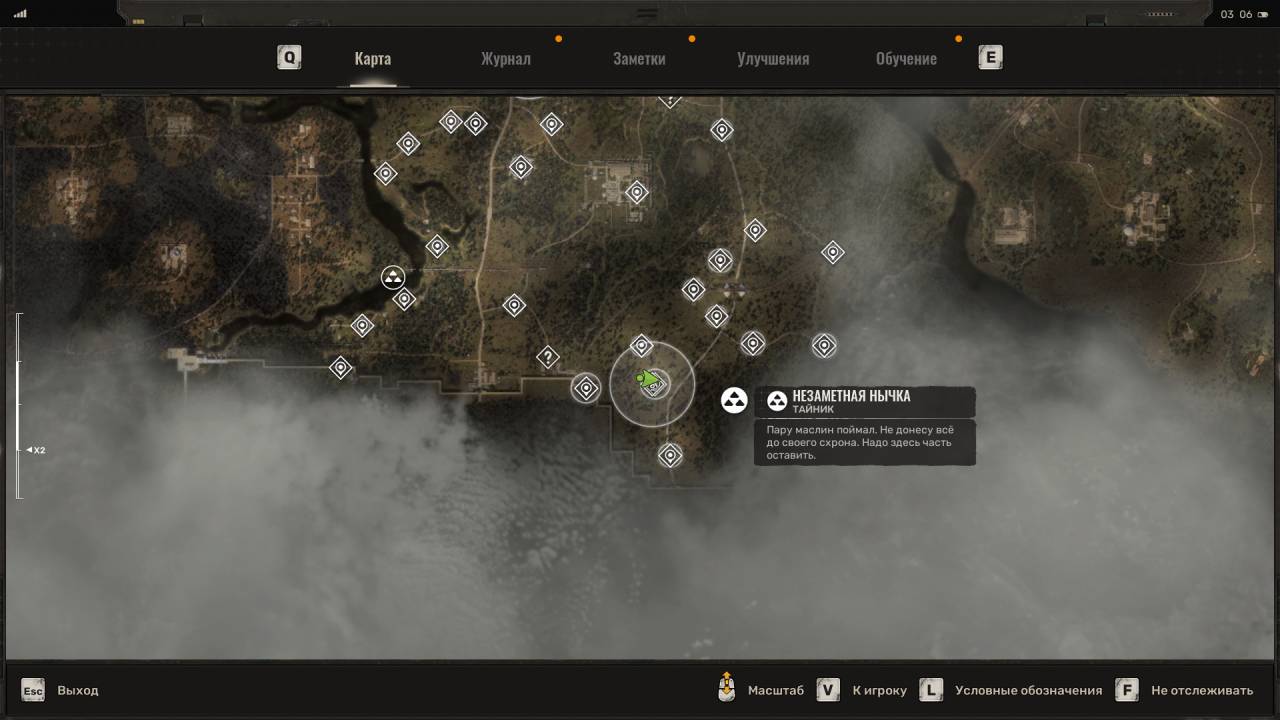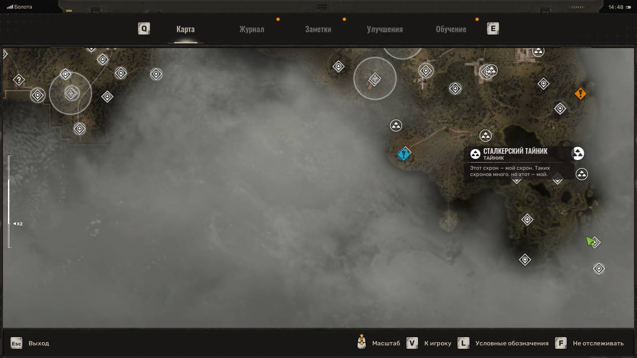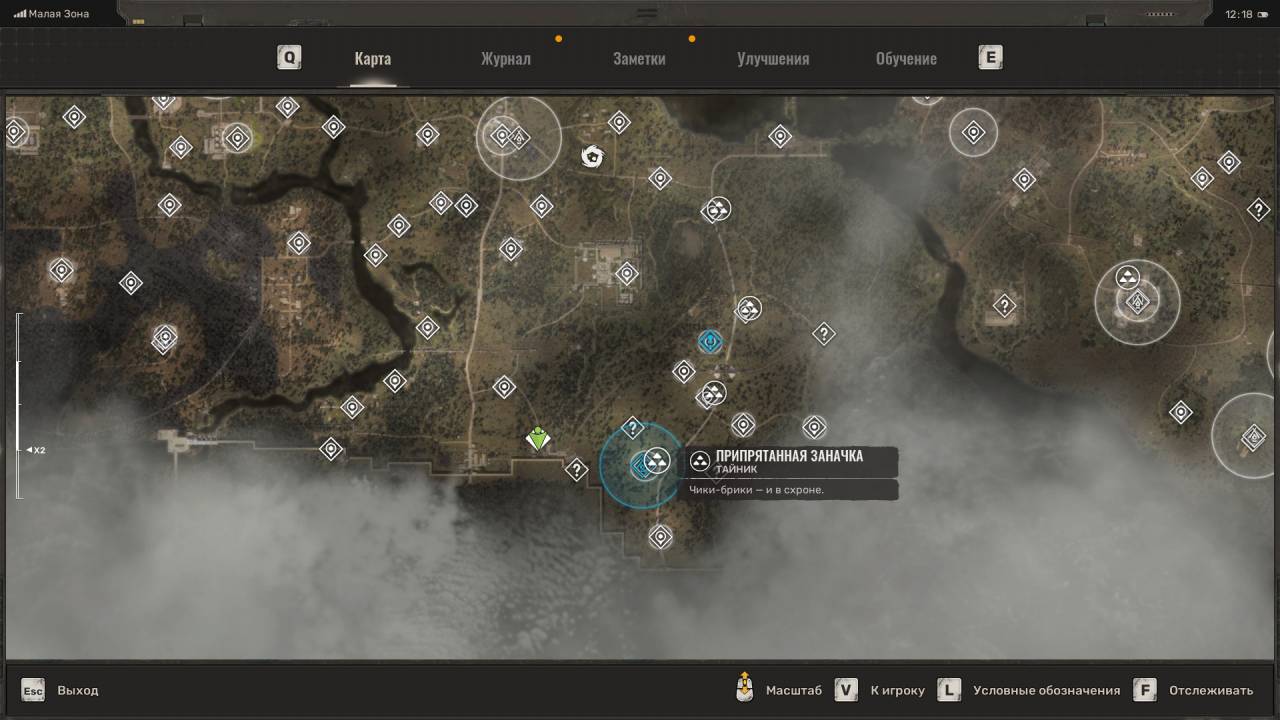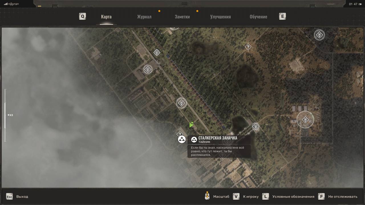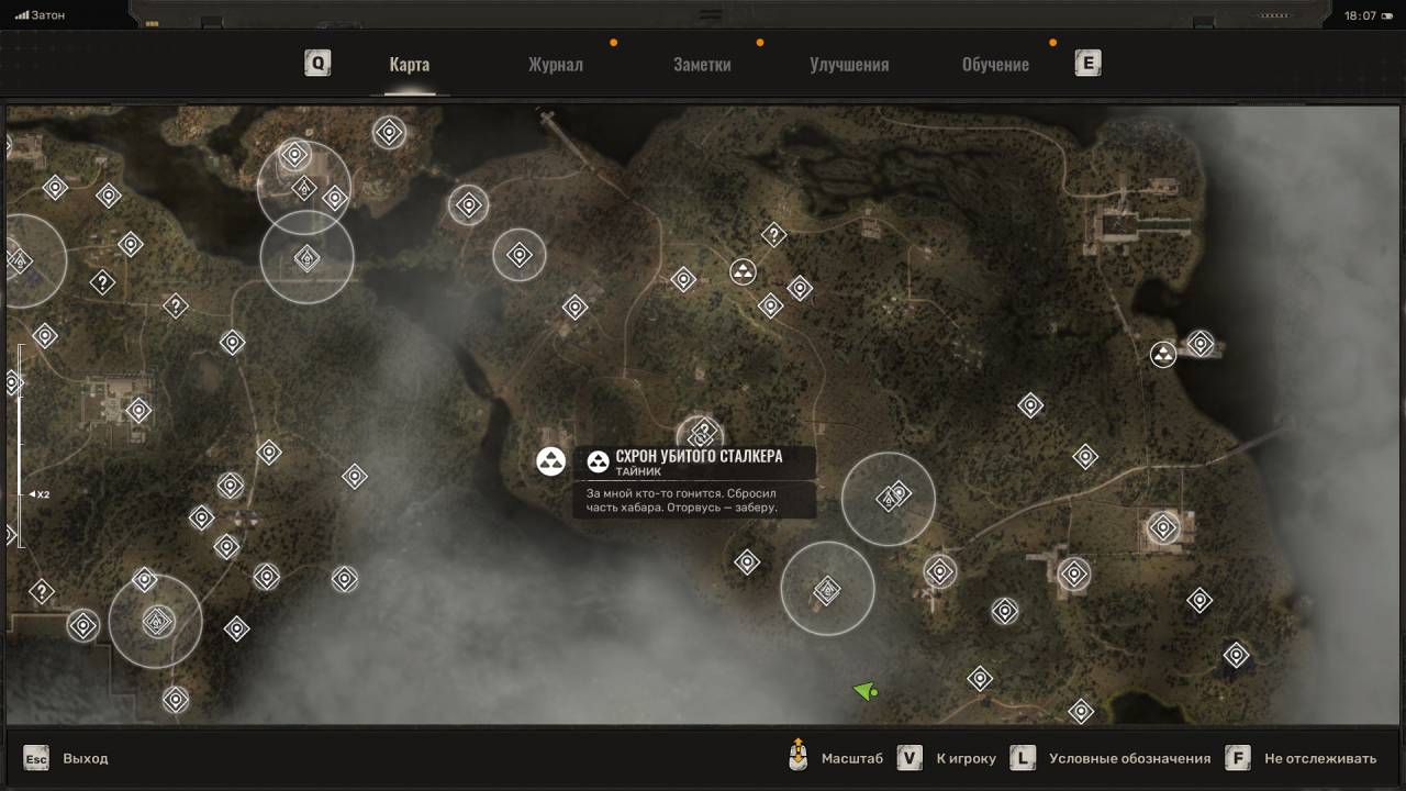 Сталкерский тайник. Этот схрон расположен на северо-востоке Болот, в месте, отмеченном на скриншоте ниже. Данный тайник расположен неподалёку от дерева, на котором висит застрявший Запорожец (ЗАЗ). Пройдите к другому дереву и обыщите сумку, лежащую под деревянным крестом (могилой). Помимо обычных припасов внутри лежит увеличенный магазин для ВС Винтарь.