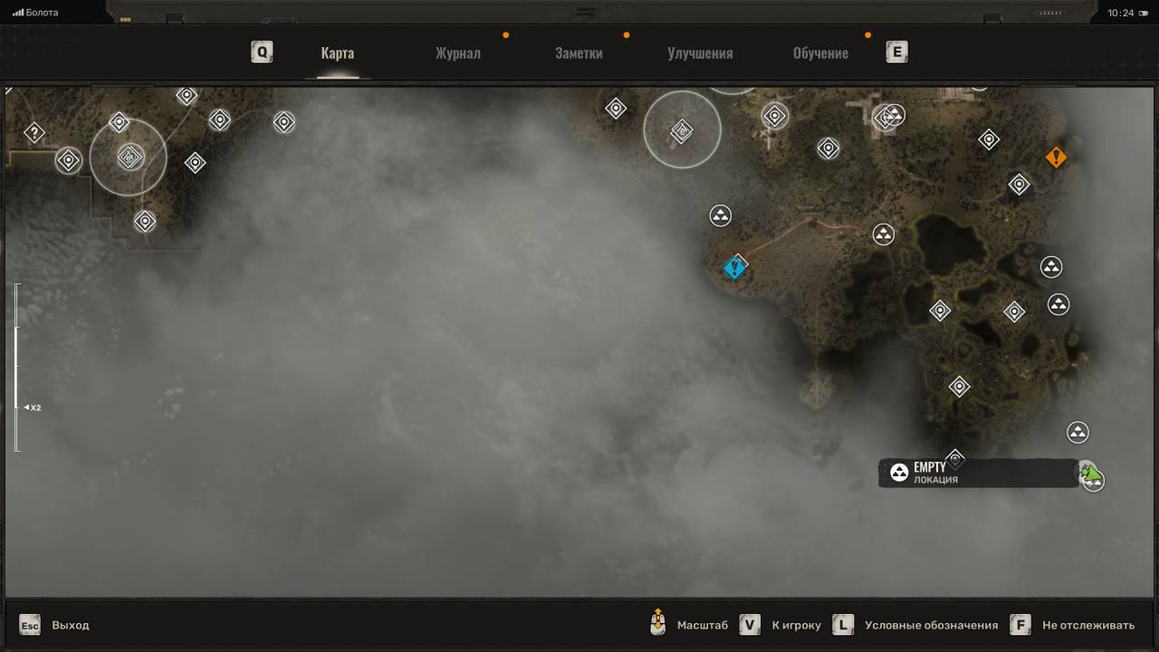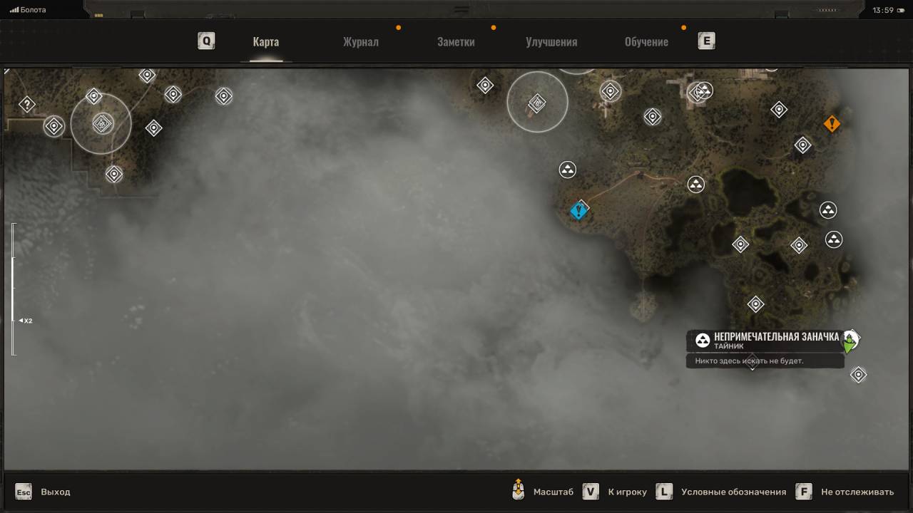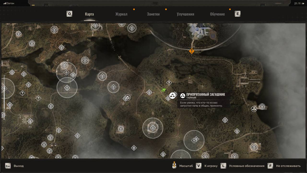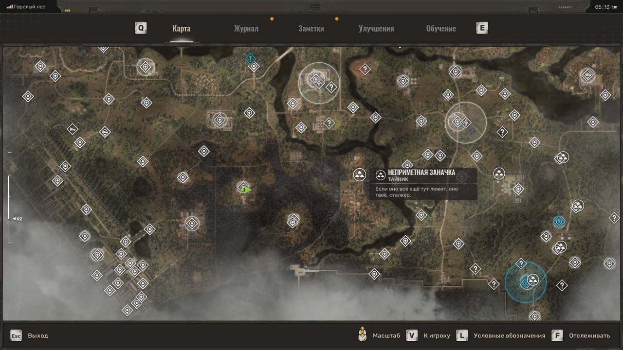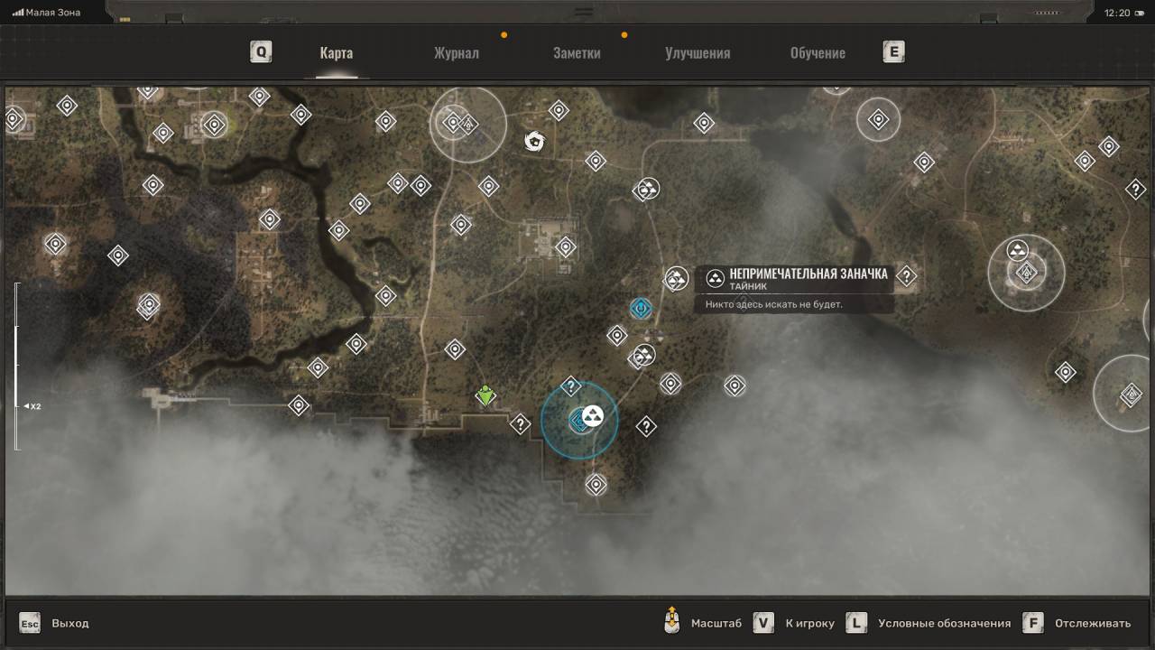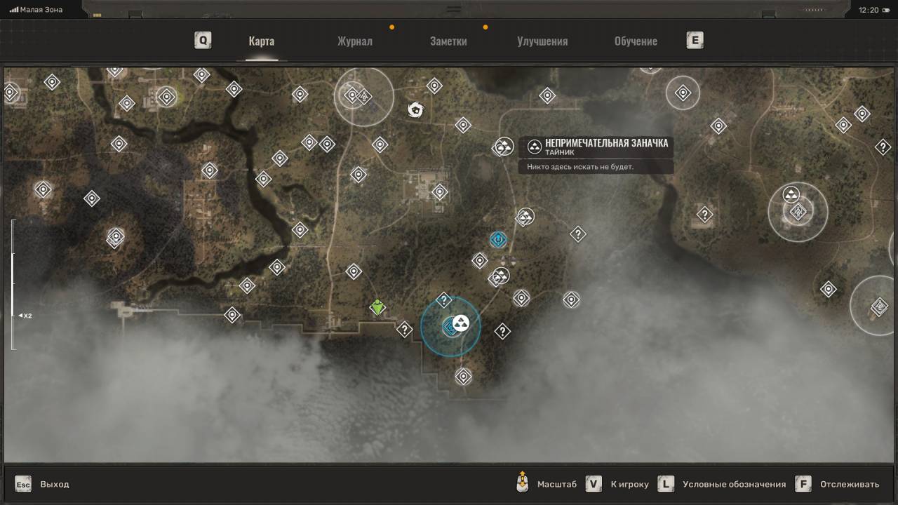 Сталкерский тайник. Этот схрон расположен на северо-востоке Болот, в месте, отмеченном на скриншоте ниже. Данный тайник расположен неподалёку от дерева, на котором висит застрявший Запорожец (ЗАЗ). Пройдите к другому дереву и обыщите сумку, лежащую под деревянным крестом (могилой). Помимо обычных припасов внутри лежит увеличенный магазин для ВС Винтарь.