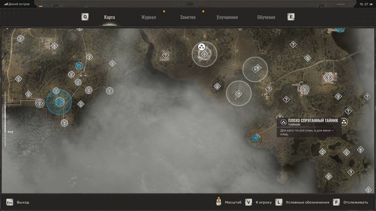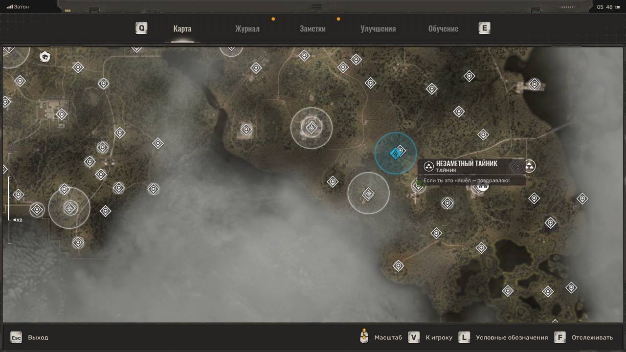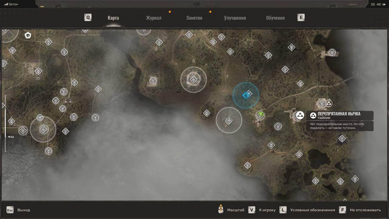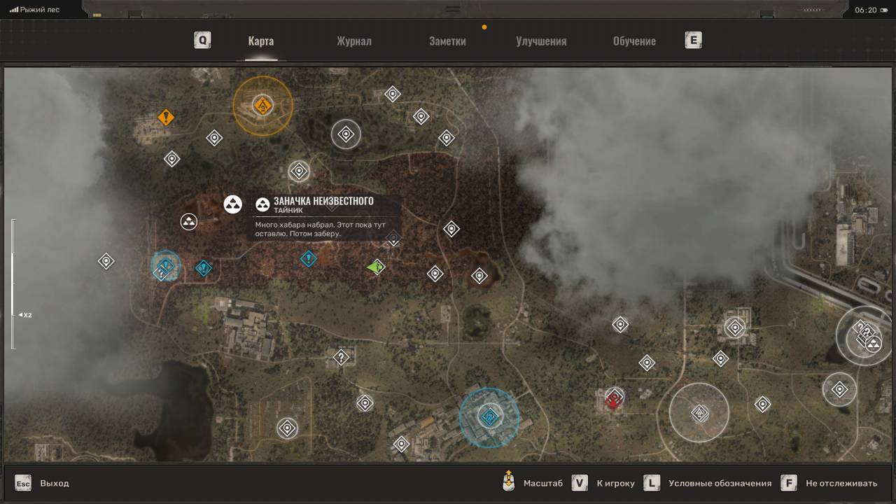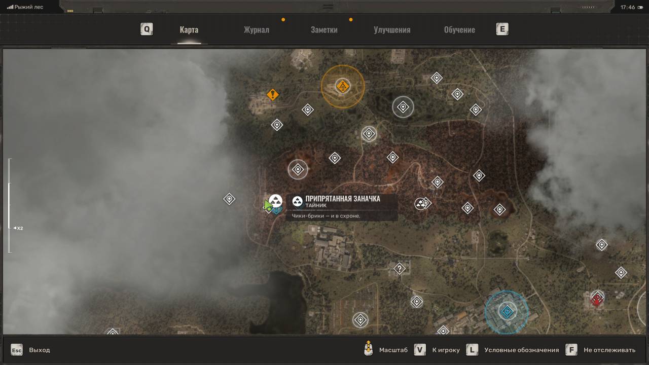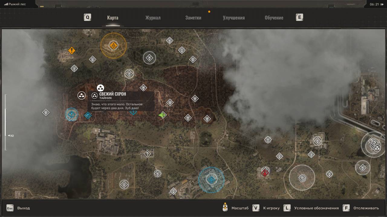 Сталкерская нычка. Появится на западе Свалки, чуть выше тайника Лёхи Легенды, в котором лежал мусорный пистолет. Достаточно сложный тайник в том плане, что добраться до него по трубе с севера невозможно, даже если вы поднимитесь на холм. Вместо этого идите на запад, пока не окажетесь на новой локации «Химический завод». Когда это случится, сверните вправо и поднимитесь на холм. Идите по данному плато обратно на Свалку, в направлении маркёра тайника, а затем спрыгните на бетонное здание ниже. Подберите комбинезон «Ветер свободы» и обыщите сумку с припасами.