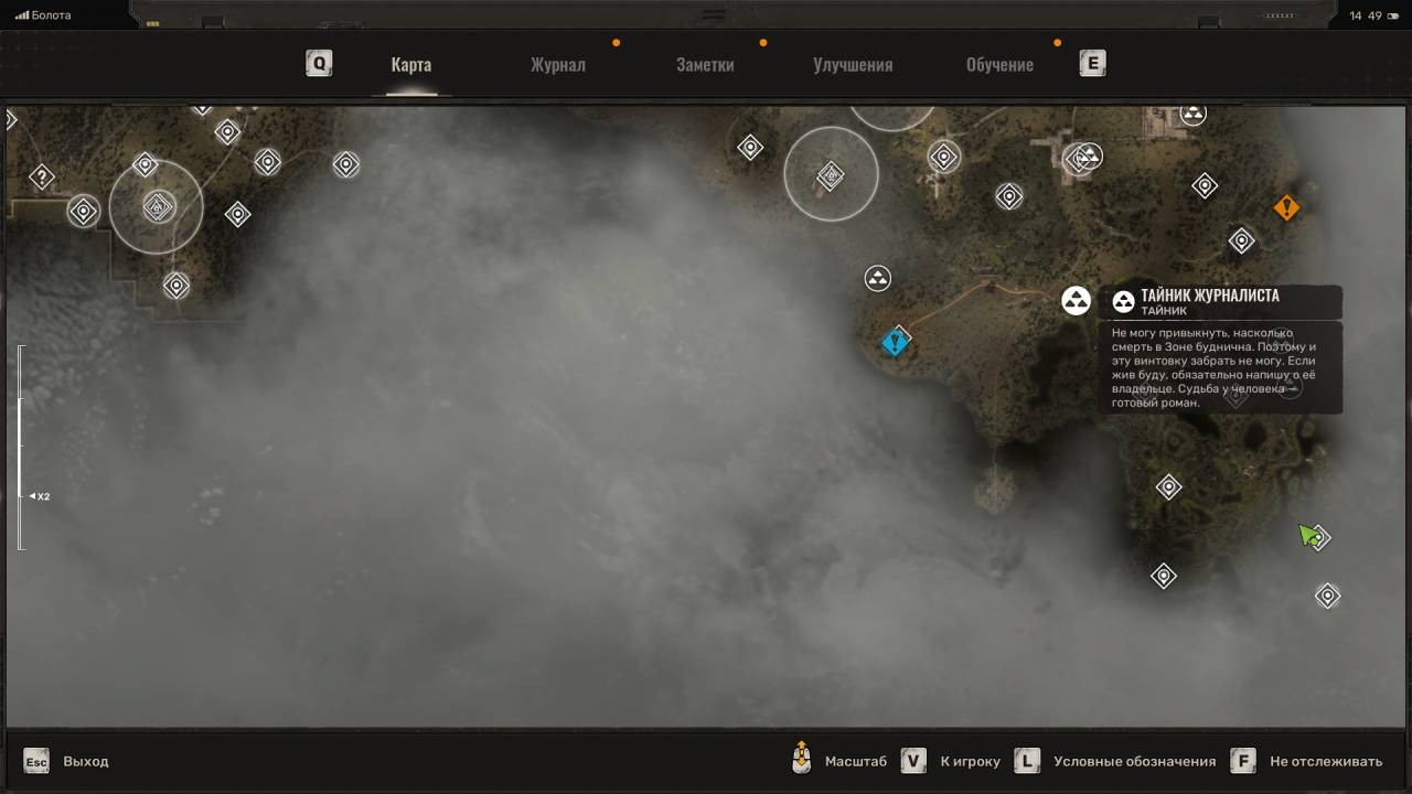 Тайник журналиста. Данный тайник расположен на северо-западе Болот, куда вы попадёте по сюжету игры с Затона. Схрон расположен на хуторе Городище. Отправляйтесь по маркёру, обойдите дом и запрыгните на трактор. С трактора прыгайте на крышу. Разбейте жёлтые хлипкие доски и обыщите контейнер в дальней части чердака. Будьте осторожны, поскольку в полу есть дыры. Внутри контейнера лежит крайней мощное оружие, Ветеран на базе ВС Винтарь и патроны к нему. Можете спрыгнуть внутрь дома, чтобы собрать ресурсы и открыть дверь изнутри.