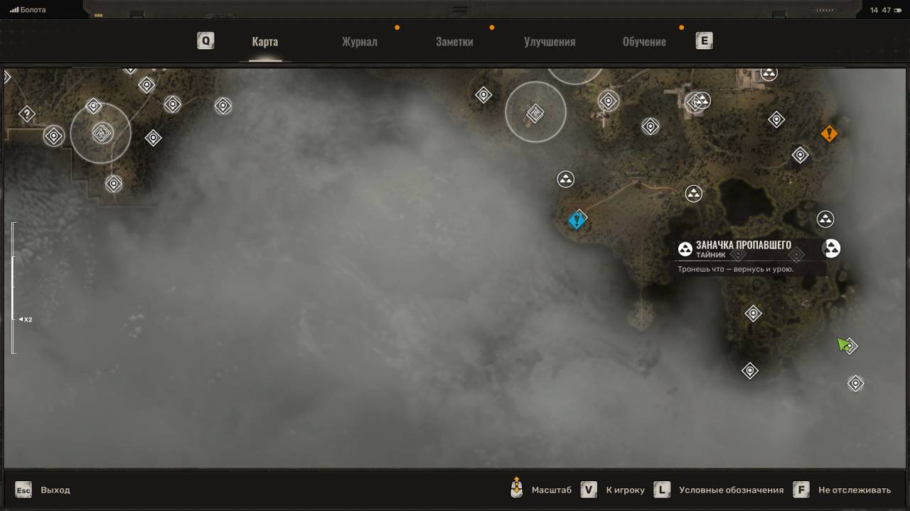Заначка пропавшего. Этот схрон расположен на северо-востоке Болот, в месте, отмеченном на скриншоте ниже. Вам нужно аккуратно обойти электрические аномалии. Для этого используйте болты. Затем заберите оружие, патроны и обыщите сумку с обычными припасами.