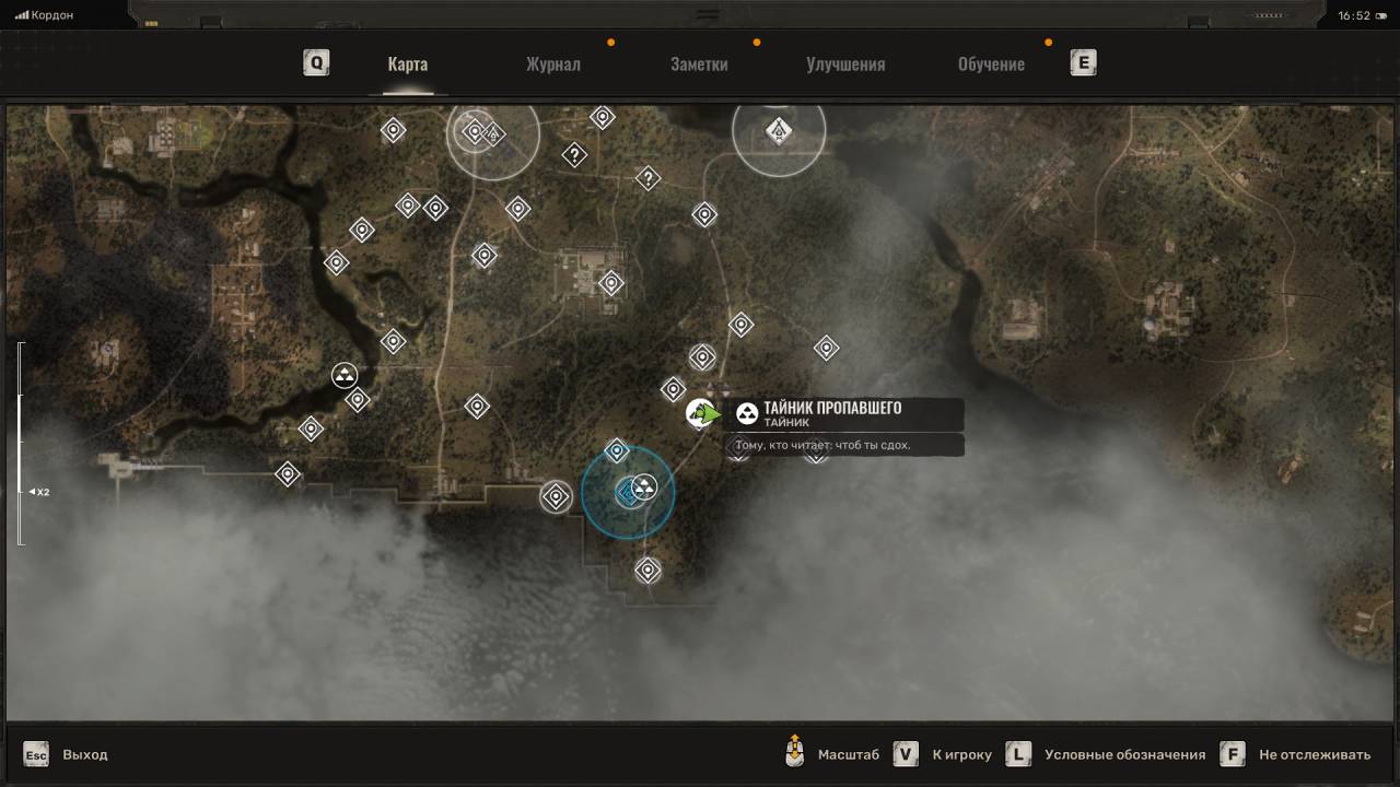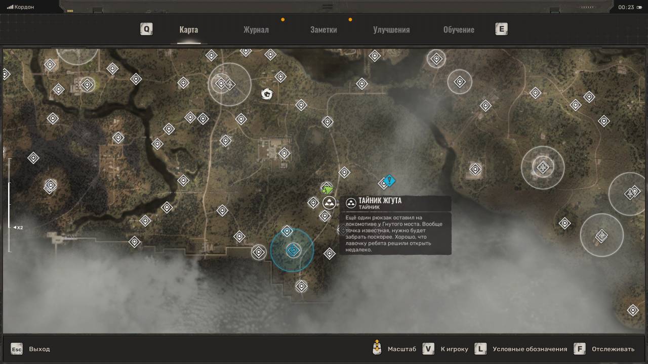 Тайник Жгута. О данном тайнике вы узнаете из КПК Жгута, которого обнаружите на Свиноферме Кордона в рамках дополнительного задания «Нездоровая конкуренция». Убейте всех мутантов и обыщите труп, чтобы обновить задачу. Подобрав КПК, вы сразу же получите маркёр тайника. Двигайтесь по маркёру, поднимитесь на железнодорожный мост и обойдите локомотив. В самом конце есть ящики. Поднимитесь по ним и двигайтесь поверху локомотива. Посмотрите через разбитое окно в кабину, чтобы увидеть рюкзак с добычей. Помимо обычных припасов вы обнаружите увеличенный магазин для системы AR416.