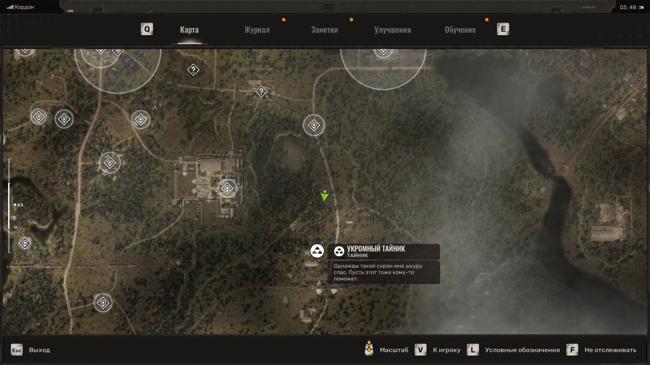 Заначка неизвестного. Отправляйтесь по маркеру схрона, чтобы оказаться в зоне с повышенной радиацией. Примите антирад и войдите в железный вагончик, расположенный ближе всего к маркёру. Внутри него будет дыру в земле, через которую вы сможете спуститься в погреб. Обыщите синий сейф. Внутри лежат различные припасы.