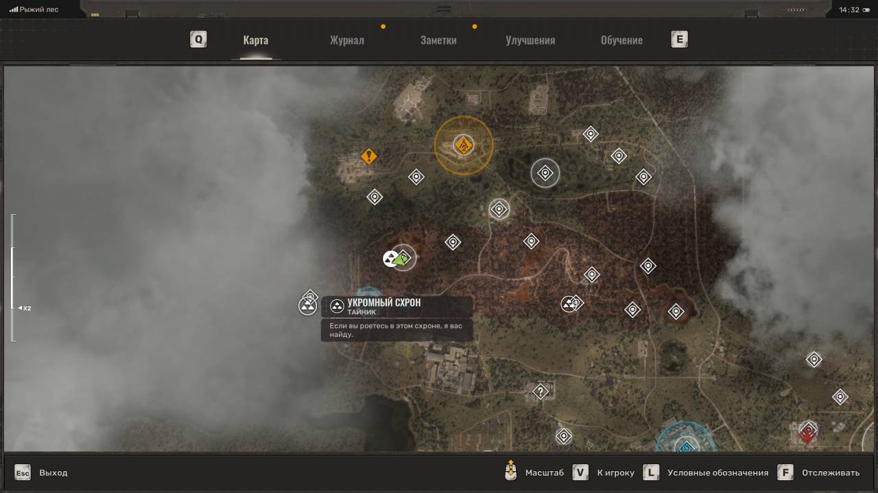 Непримечательная заначка. О данном схроне можно узнать из записки, которая лежит в хижине, через которую вы попадаете на базу Чистого неба (после настройки четырёх пси-маячков). Находится тайник к северу от базы Чистого неба. Дом окружён пузырями, так что используйте болты для их обезвреживания. Двигайтесь по маркёру, заберитесь внутрь дома через окно и обыщите рюкзак, висящий на вешалке. Внутри лежат обычные припасы. На самом деле это не схрон. Посмотрите под ноги и расстреляйте жёлтые доски, чтобы обнаружить сумку. Среди обычных припасов в ней лежит ракета для РПГ и увеличенный магазин для Фора-221 и Kharod.