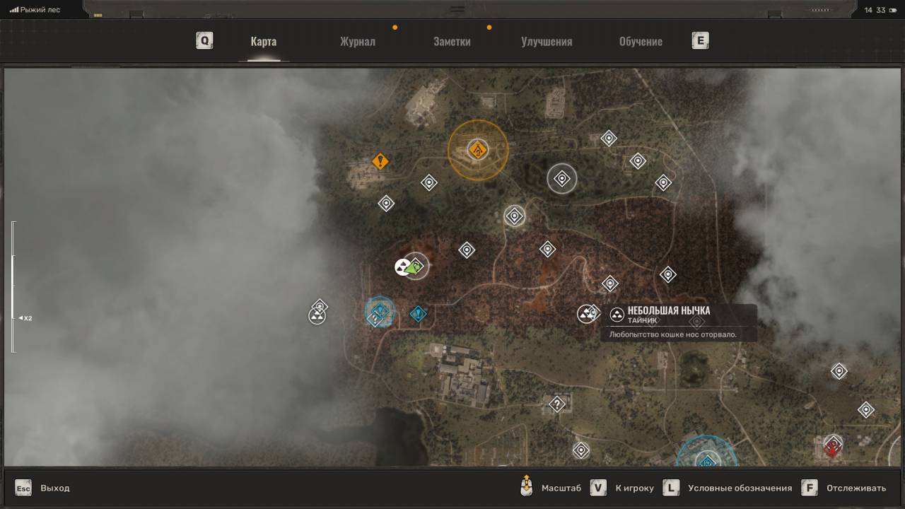 Укромный схрон. На западе Рыжего леса расположен мост в Лиманск — локацию, которая недоступна в основной игре STALKER 2. Внутри сундука можно отыскать чертёж «Свинцовый контейнер» для ПС3-9И «Сокол» и прочие припасы. Доберитесь до отмеченного места. Вы посетите его, когда будете искать Духа в рамках квеста «Рубеж». Прижмитесь к стене слева от разрушенного моста и обойдите скалу, чтобы обнаружить сумку. Среди прочего в ней лежит чертёж «Индивидуальная подгонка» для СВУ-МК С-3.