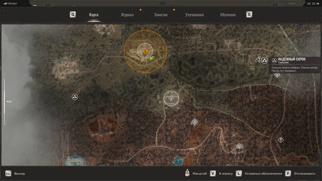 Припрятанная заначка. Этот схрон следует искать на территории Деревни Новичков. Чтобы добраться до рюкзака с добычей, обойдите отмеченный дом. Рюкзак спрятан на крыше, под шифером. У входа в дом, рядом с забором лежат брёвна. Прыгните на брёвна, а с них — на забор. По забору пройдите на крышу уличного туалета, а уже оттуда прыгните на крышу дома. Пригнитесь и взаимодействуйте с рюкзаком, который виден через дыру. Помимо обычных припасов внутри будет чертёж «Система выведения ядовитых веществ» для экзоскелета.