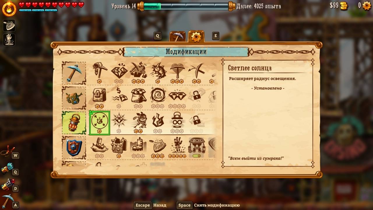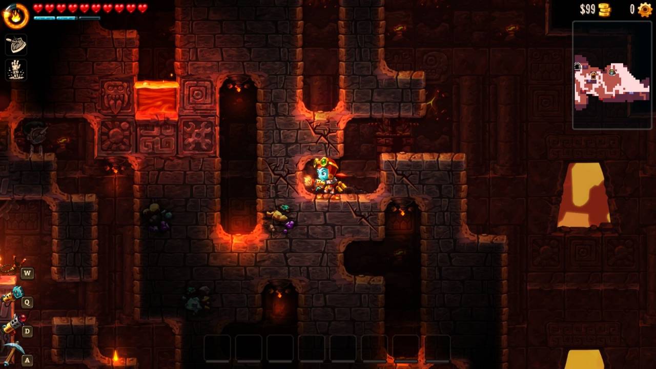«„Майнкрафт“ какой-то», — скажете вы, и будете совершенно неправы. SteamWorld Dig 2 предлагает нам не только пробивать земную породу в поисках Расти и ценных минералов, но и решать головоломки, связанные c гаджетами героини. Так, крюком-кошкой можно цепляться за стены и потолок, а на реактивном ранце, который получаешь под конец игры, — пролетать небольшие расстояния. Игра действительно богата на механики. Причём не успеваешь устать от одной способности, как на смену ей предлагают другую.