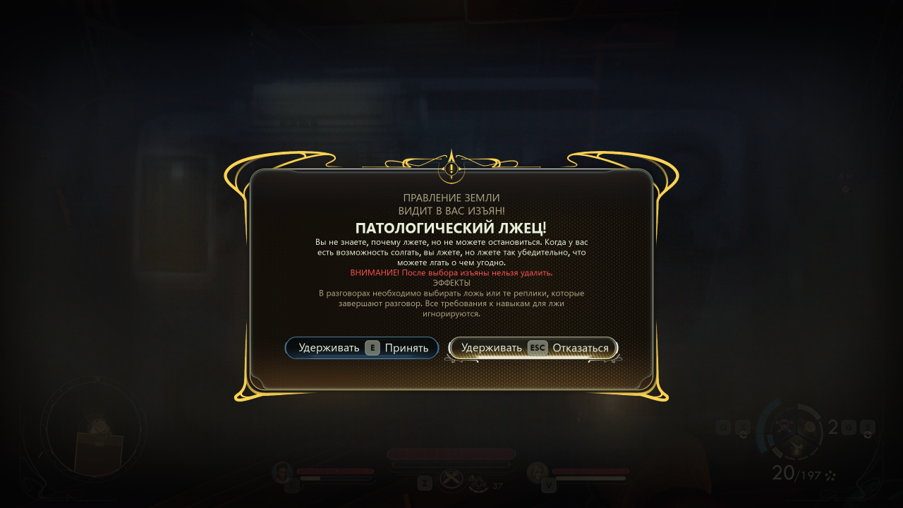 Некоторые изъяны довольно весёлые, и их хочется брать просто ради мемов. А другие могут сильно повлиять на стиль игры, поэтому стоит дважды подумать, перед тем как принимать новую черту. Азартным игрокам в какой-то момент предложат вообще не отказываться от изъянов. Взамен можно получить лишние баллы характеристик при повышении уровня, но вот стоит ли оно того, если со временем агент Правления станет патологическим лжецом, клептоманом и просто ходячей бедой?..