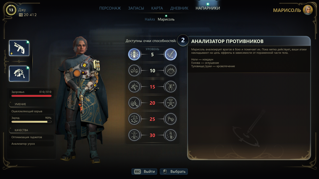 К тому же по ходу игры постепенно открываются новые способности и гаджеты: спрей с кислотой, чтобы не оставлять после себя улики; очки, которые позволяют видеть сквозь стены; маска с защитой от газа; ботинки с двойным прыжком; отвлекающие гранаты; и знакомое по первой части замедление времени. С таким набором мне не приходилось скучать до самого финала, ведь я постоянно комбинировала стелс с экшеном и испытывала трудности разве что на боссах — из-за выбранных изъянов мой персонаж становился невероятно слабым после обнаружения, но смертоносным в тени.