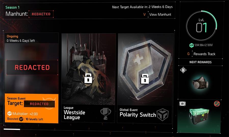 Через неделю после запуска расширения начнётся первый из нескольких запланированных сезонов, который продлится три месяца. Каждый сезон представляет собой многоэтапную охоту за агентом-ренегатом, во время которой предстоит постепенно выполнять задания в двух городах. «Не хочется портить сюрприз и рассказывать концовку, но есть веская причина, почему сезоны в игре существуют, — пояснил разработчик. — Они очень тесно связаны с финалом сюжета и станут для игроков причиной продолжить изучать мир The Division 2».